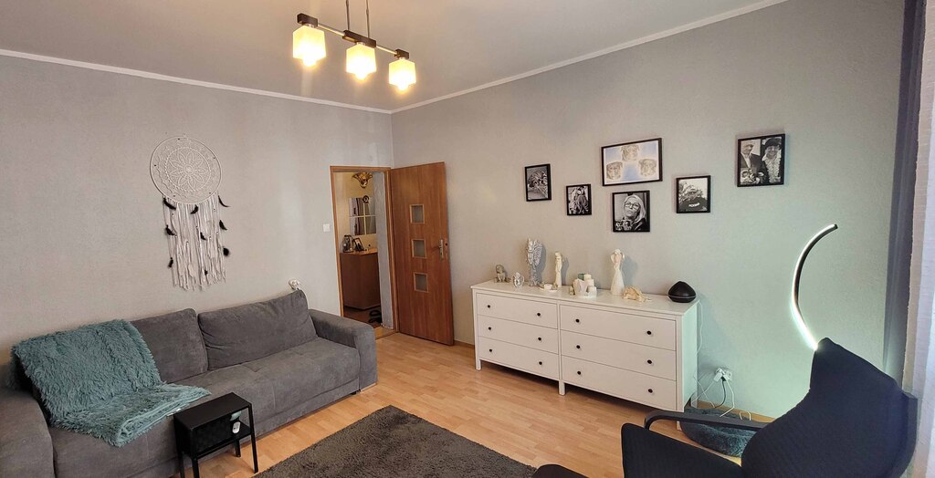 W pomieszczeniach na podłogach panele, w jednym parkiet. Wysokość pomieszczeń to 310 cm do daje poczucie większej przestrzeni. Ściany gładzone i malowane w jasnych tonacjach. Ciepła woda i ogrzewanie z sieci miejskiej. Czynsz do zarządcy z zaliczkami na media 847 złotych + 150 zł Fundusz Remontowy. Mieszkanie posiada dużą suchą piwnicę (ok. 12,5 m2 ).