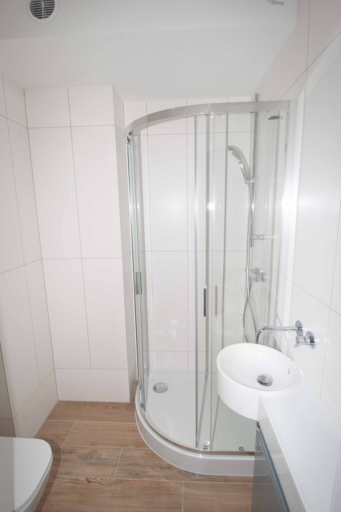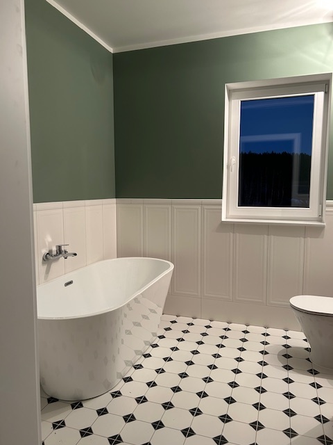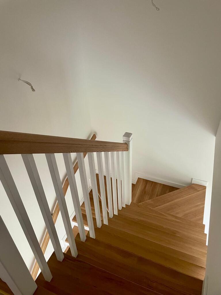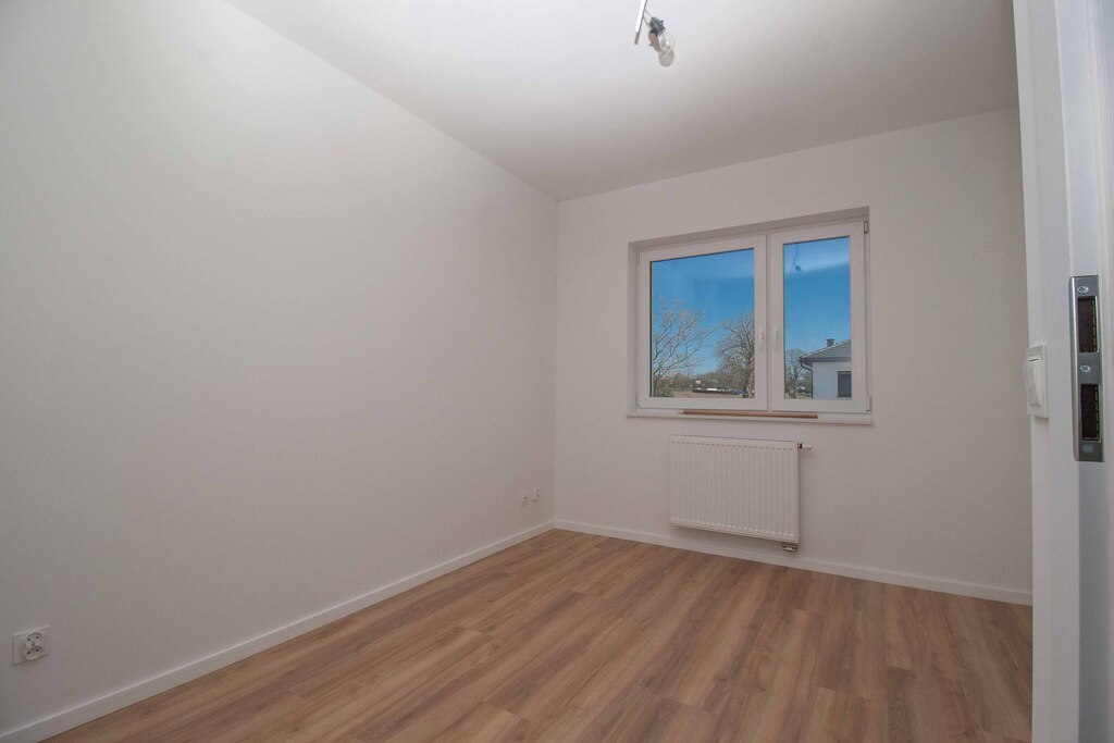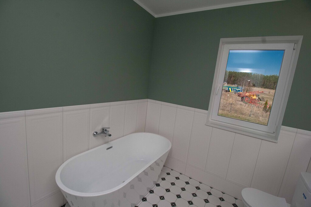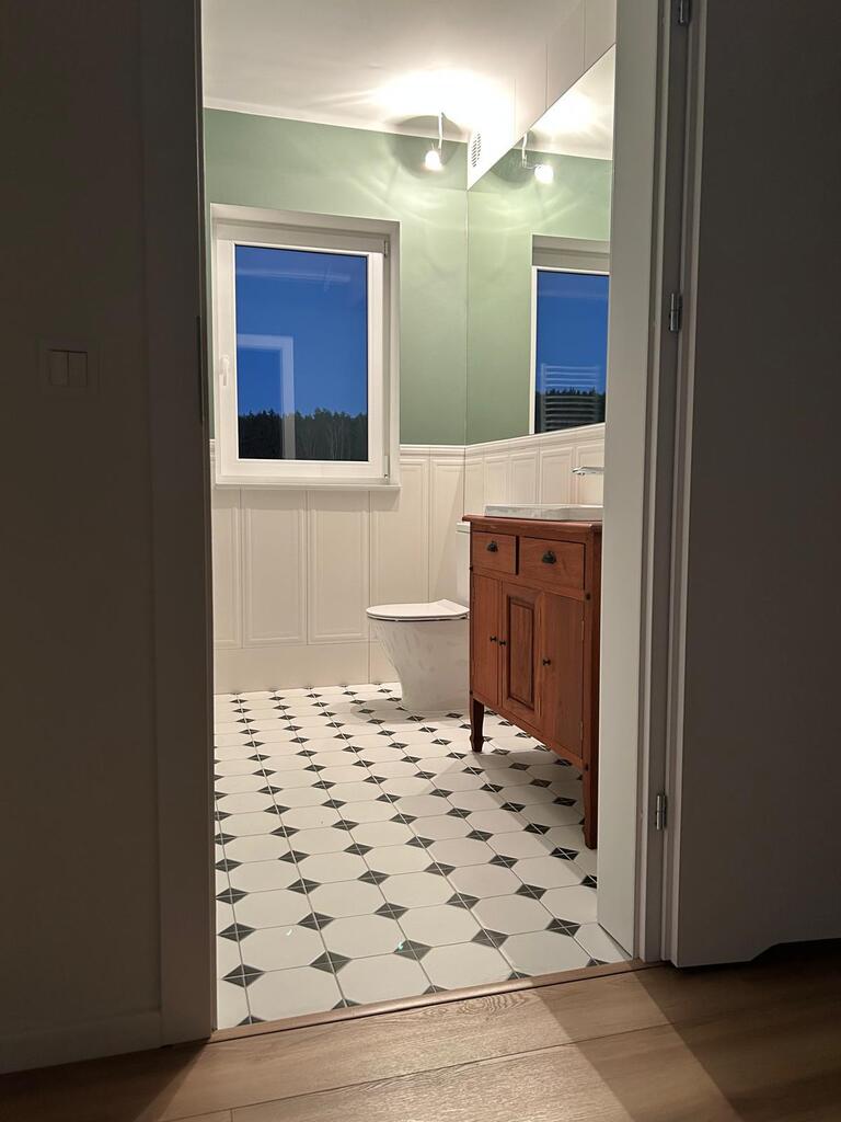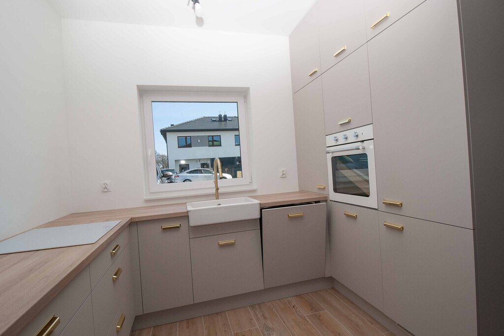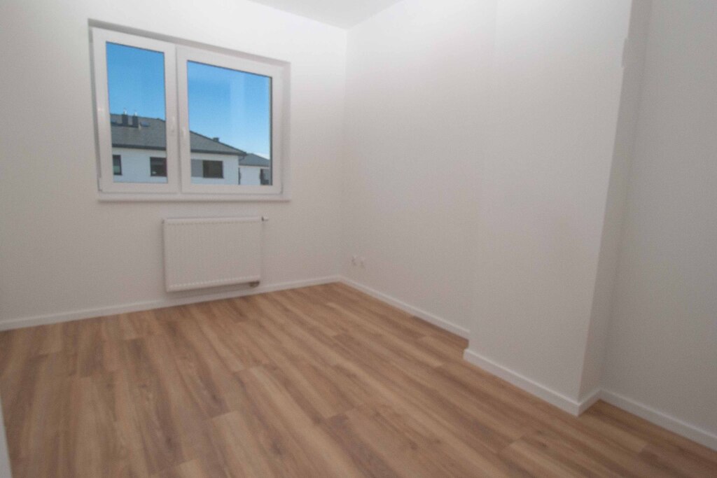 Parter: wiatrołap ( 2,68 m2 ), korytarz ( 1,88 m2 ), pomieszczenie gospodarcze ( 2,86m2 ), łazienka ( 2,61 m2 ,prysznic, wc ), salon z jadalnią ( 25,45 m2 ), aneks kuchenny ( 8,46 m2 ). Na pierwszym poziomie ogrzewanie podłogowe. Z salonu wyjście na taras i dalej na ogród. Na piętro prowadzą dębowe schody. Na podłogach płytki imitujące drewno.
