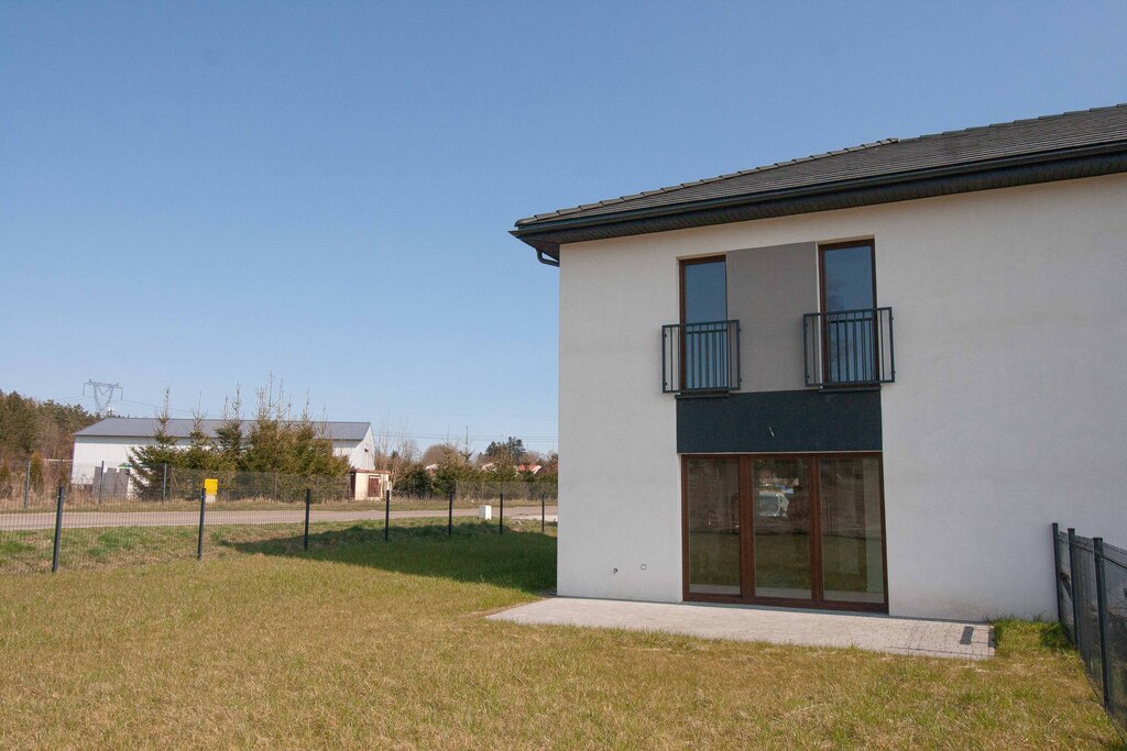 Powierzchnia domu to 98,28 m2, działka ma 438 m2. Działka płaska, ogrodzona płotem i obsadzona trawą.