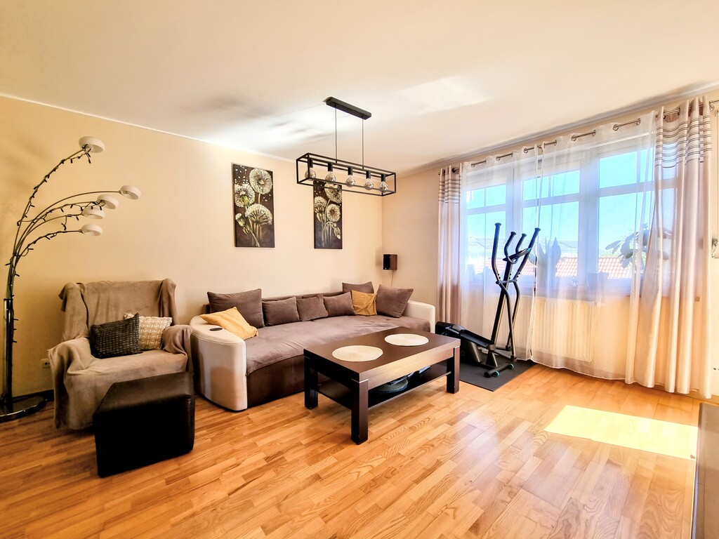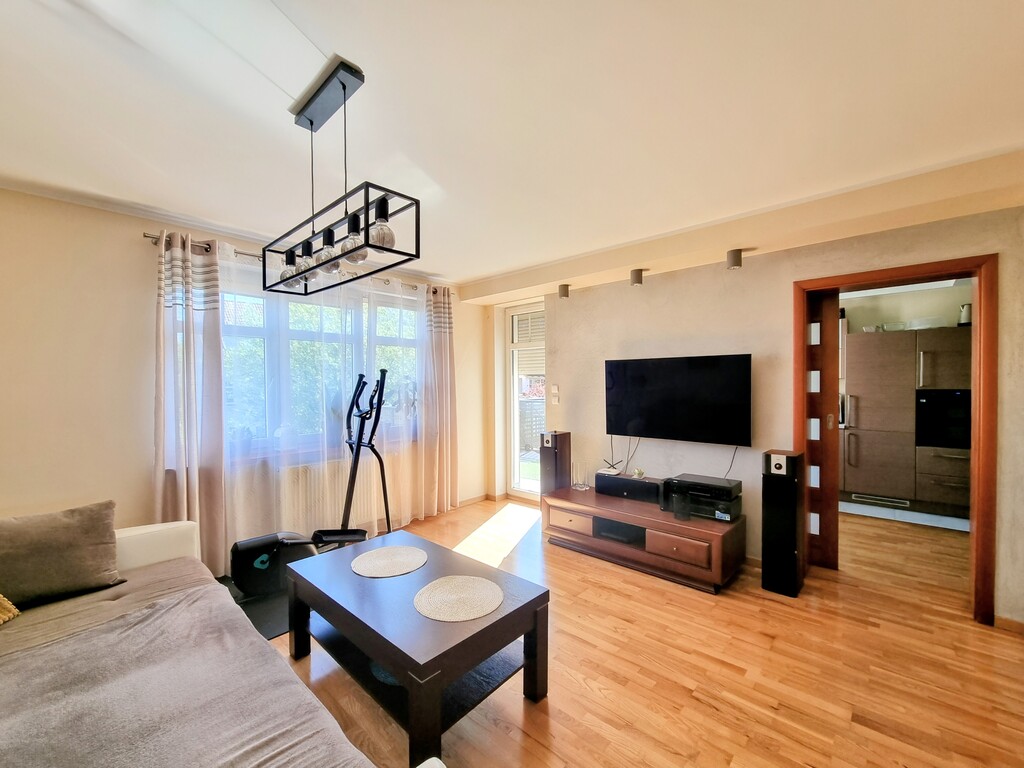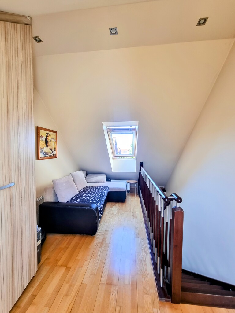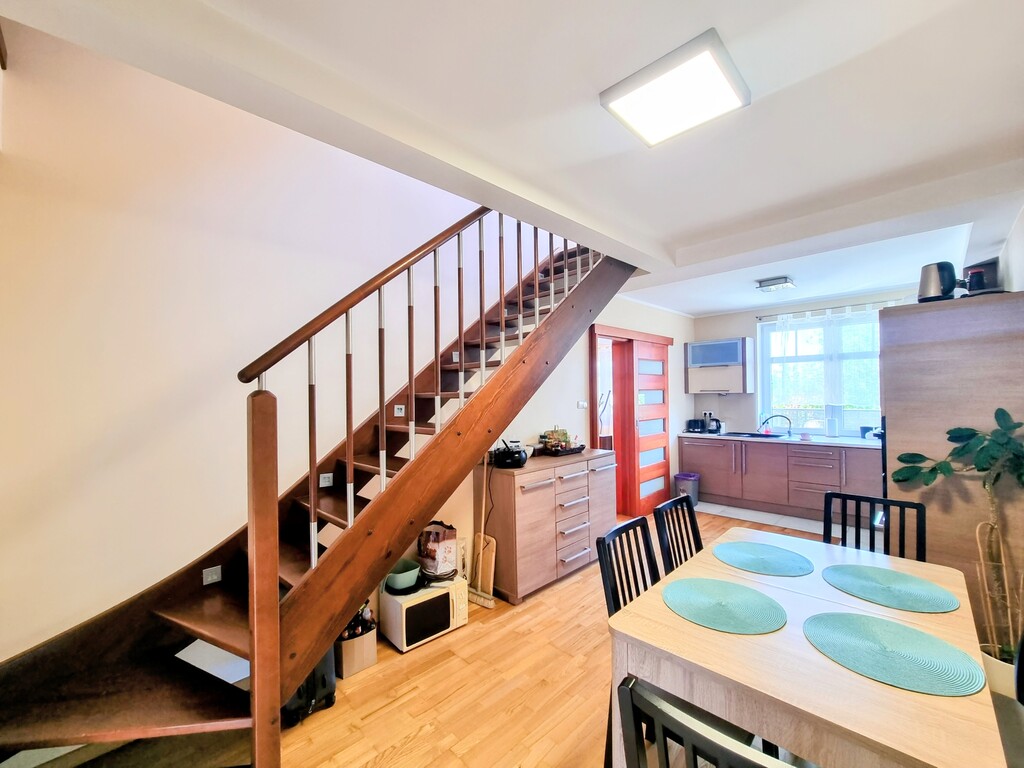 Wysoki standard wykończenia: łazienka po kompleksowym remoncie – elegancka ceramika i nowoczesne armatury; solidne, drewniane schody prowadzące na antresolę; na podłogach trwałe panele podłogowe i gres, gwarantujące komfort i łatwość utrzymania czystości.