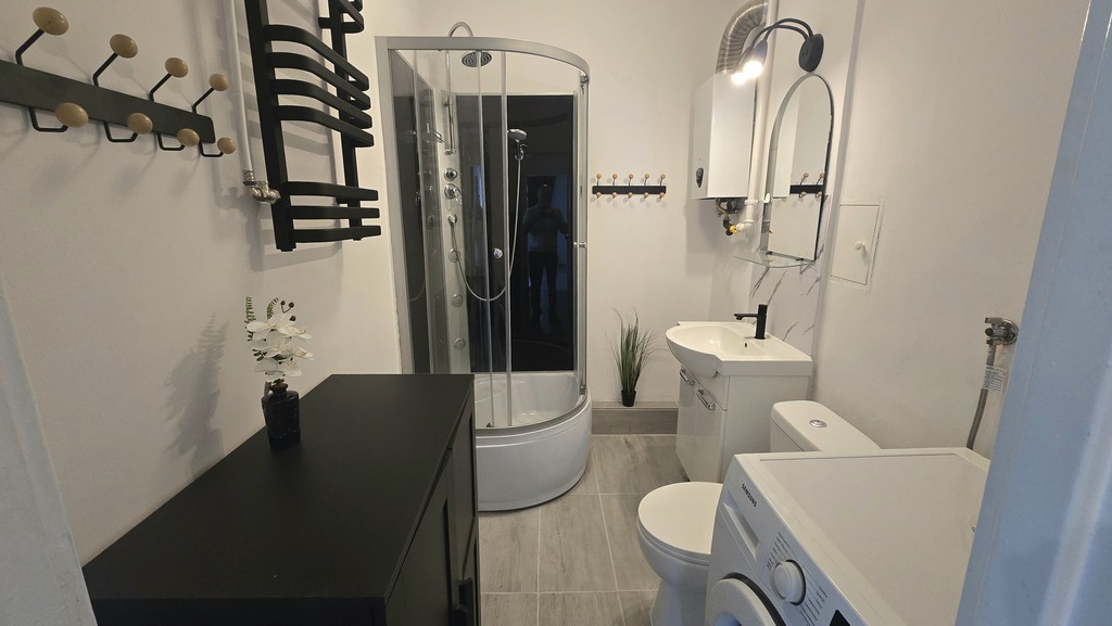 - łazienka z prysznicem i pralką
