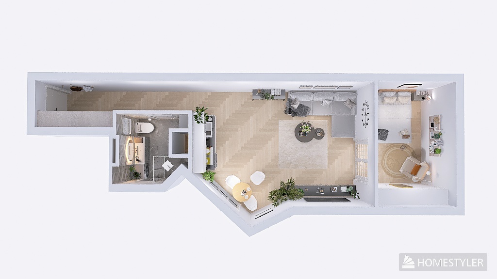 Metraż lokalu to 48,23m2, składa się z przedpokoju, łazienki razem z toaletą, salonu z aneksem kuchennym oraz sypialni. Wszystkie pomieszczenia są zaprojektowane bardzo funkcjonalnie oraz zachowują pełną wysokość w każdym punkcie.