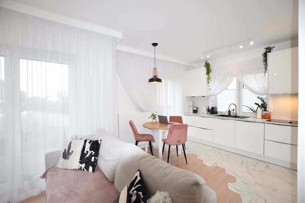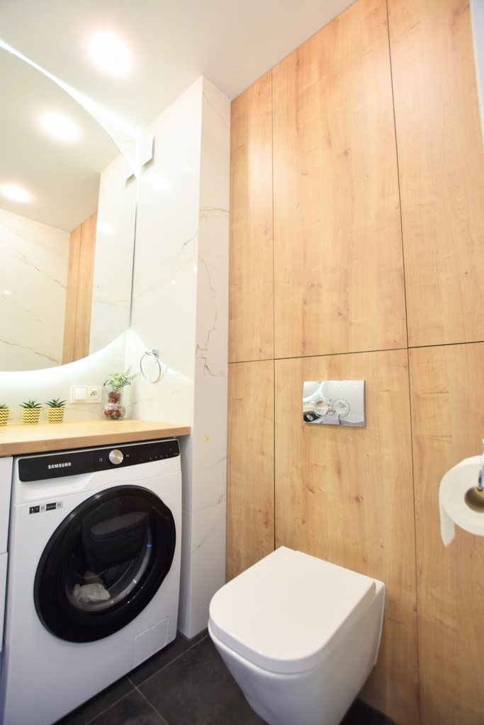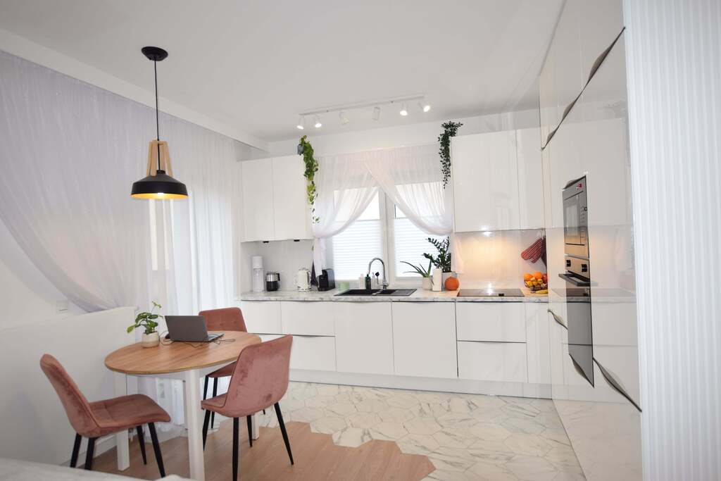 Przestronny salon wraz z aneksem kuchenny o powierzchni 21m2. Kuchnia w zabudowie, wyposażona w dużą ilość funkcjonalnych wysuwanych mebli. Cały sprzęt zabudowy kuchennej marki Samsung.