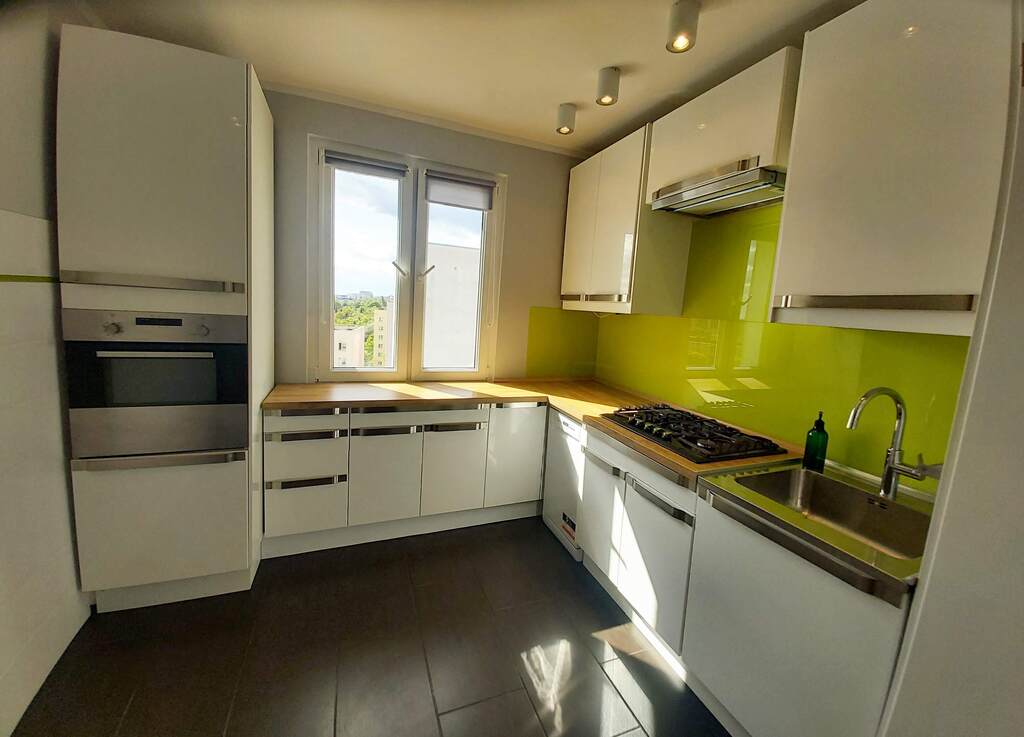 Duża widna kuchnia zabudowana meblami na wymiar wraz z sprzętem AGD.