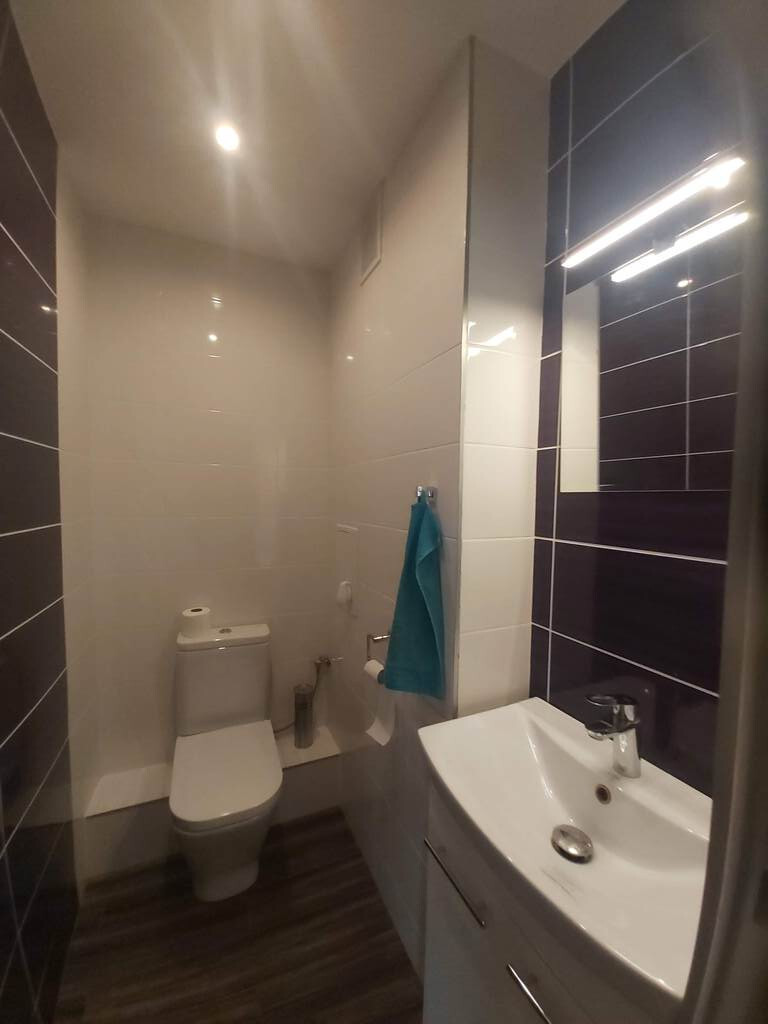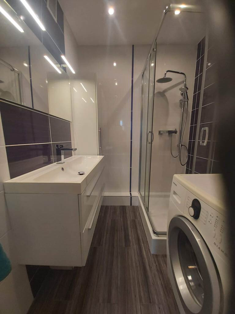 Ładna jasna łazienka z kabiną prysznicową oraz oddzielna toaleta. Mieszkanie jasne, słoneczne, przestronne.
