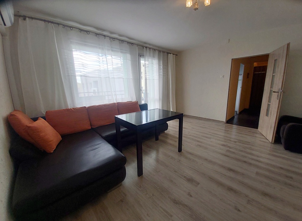 Duży pokój dzienny z wyjściem na przestronny balkon, w pokoju zainstalowano urządzenie klimatyzacyjne.