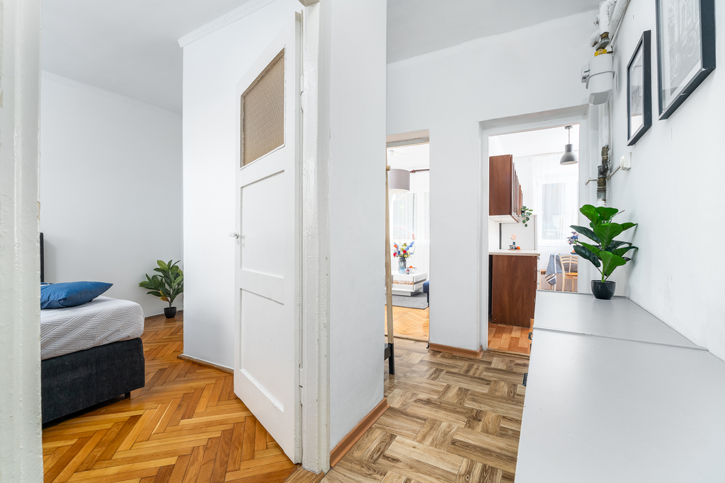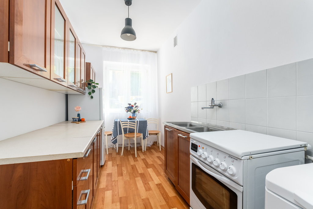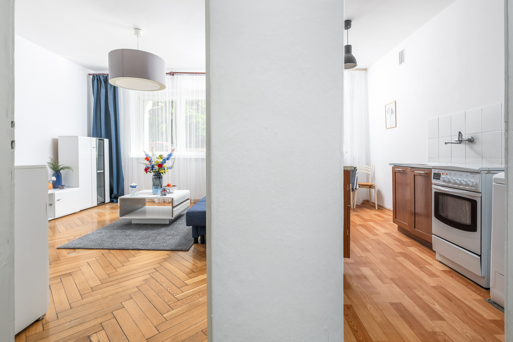 Na sprzedaż 2 pokojowe mieszkanie o powierzchni 44,39m2. Położone na parterze z bezpośrednim wejściem z ulicy. Na powierzchnię mieszkalną składają się dwa rozkładowe pokoje ( sypialnia od zachodu, pokój dzienny od wschodu), oddzielna duża kuchnia z oknem od podwórka, korytarz oraz łazienka z oknem.  Mieszkanie przez ostatnie lata było wynajmowane, natomiast wymaga remontu lub odświeżenia. W cenie może pozostać obecne umeblowanie oraz wyposażenie ( z wyłączeniem dodatków). Okna PCV z wywietrznikiem. W pokojach zachowana piękna klepka drewniana, w przedpokoju wykładzina PCV. Czynsz do wspólnoty wynosi aktualnie 333zł ( w tym 3m3 wody). Dodatkowo prąd oraz gaz wg wskazań liczników. Do mieszkania przynależy spora piwnica ( niewpisana do KW).