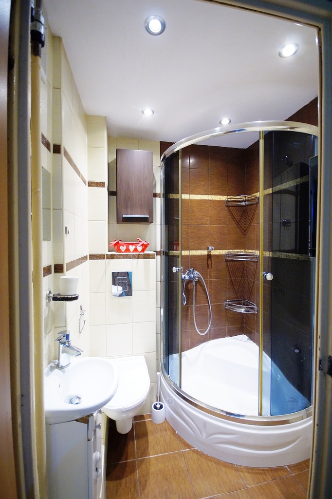 - Łazienka: Wyposażona w kabinę prysznicową, WC, umywalkę. Jest także miejsce na małą pralkę.