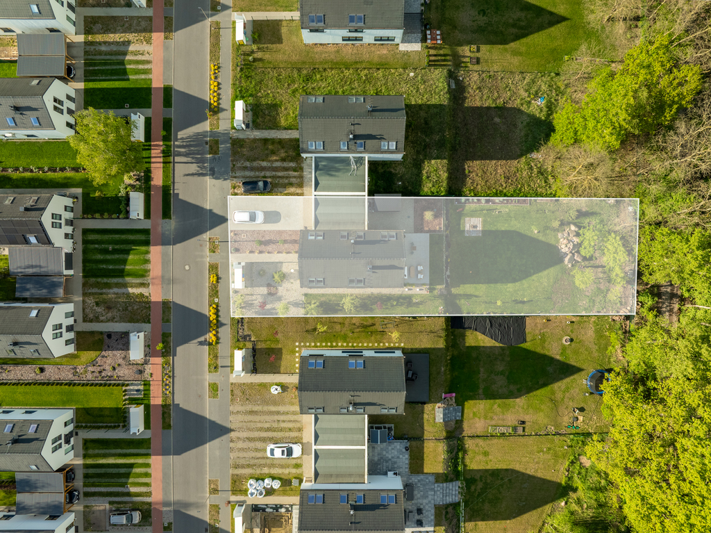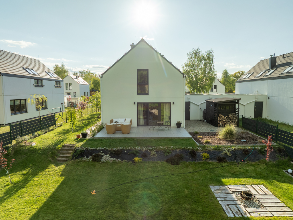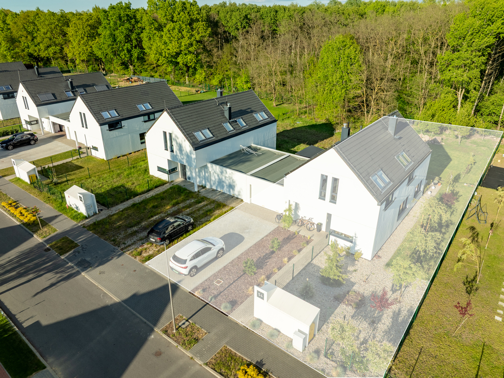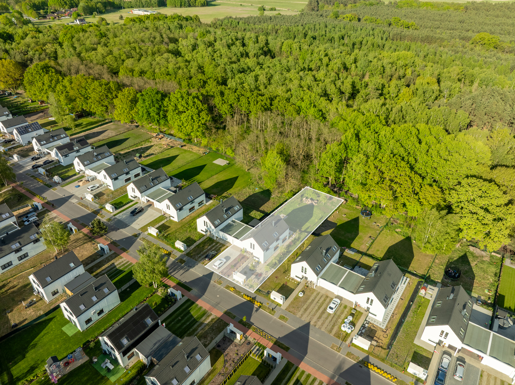 Dom położony w otulinie lasu na zamkniętym i monitorowanym osiedlu w Grzepnicy, gdzie mieszkańcy tworzą zgraną społeczność.