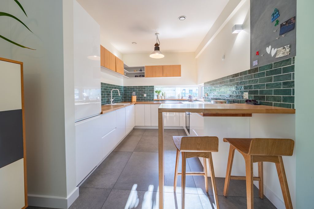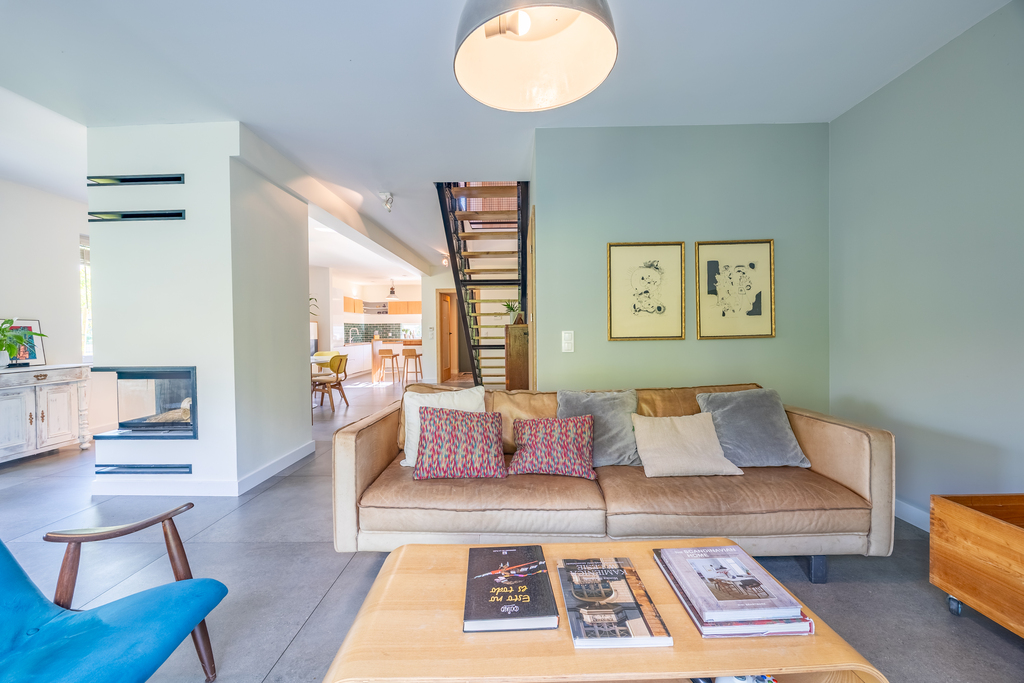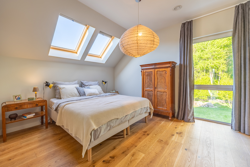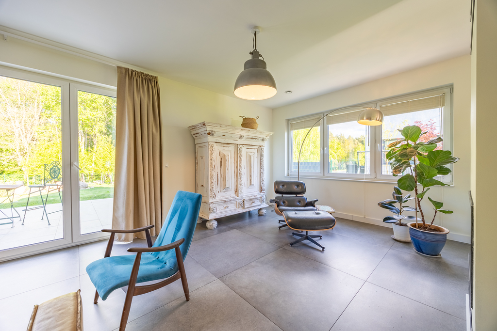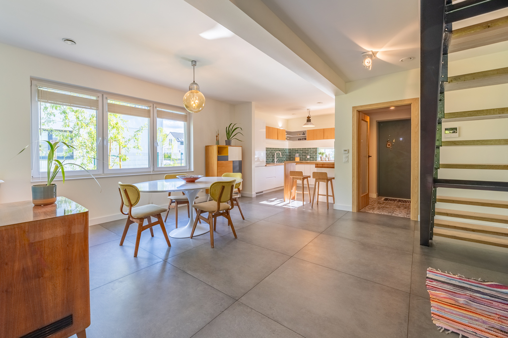 Funkcjonalny układ pomieszczeń i nietuzinkowa aranżacja wnętrz: korzystne strony świata i nasłonecznienie przez dużą powierzchnię okien.