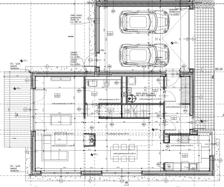 parter: hall 7,82m2, przestronny salon 50,18m2 z kominkiem i wyjściem na taras od strony południowo-zachodniej, kuchnia 8,91 m2, WC 4,73m2 , pomieszczenie gospodarcze oraz 2 stanowiskowy garaż- 33,05m2.