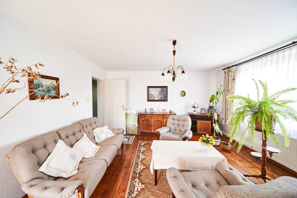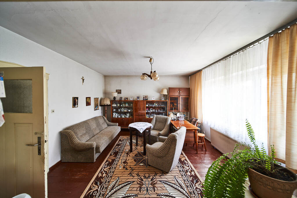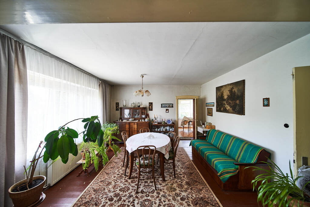 Parter domu stanowi salon ze starymi, przesuwnymi drzwiami, 3 pokoje, kuchnia ze spiżarką, łazienka z oknem i przedpokój.