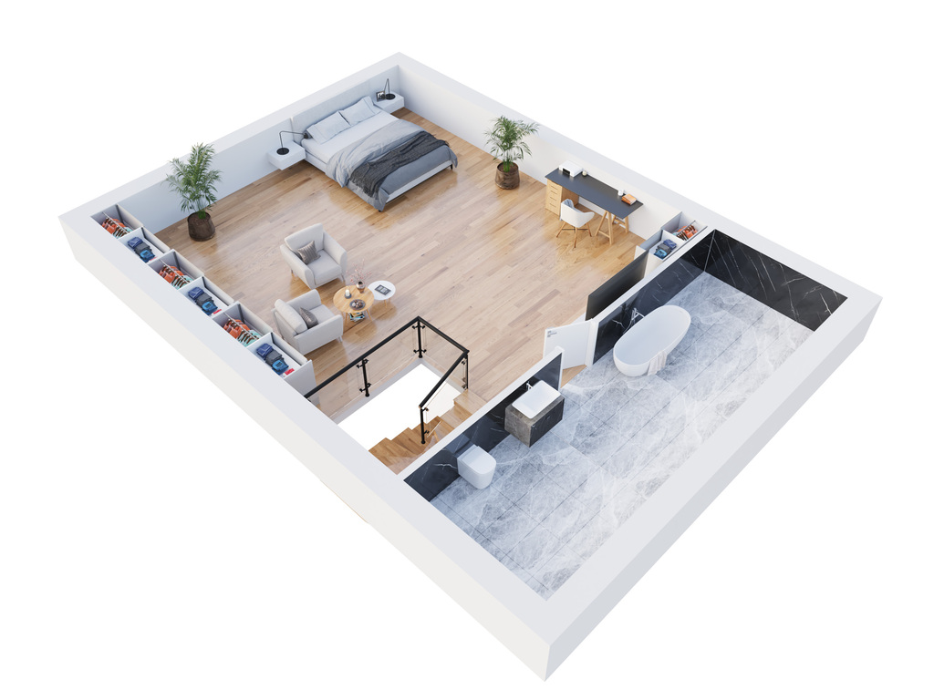 b. przestronność - salon z aneksem kuchennym (45m2), dwa pokoje, łazienka, sypialnia z osobną łazienką (40m2)