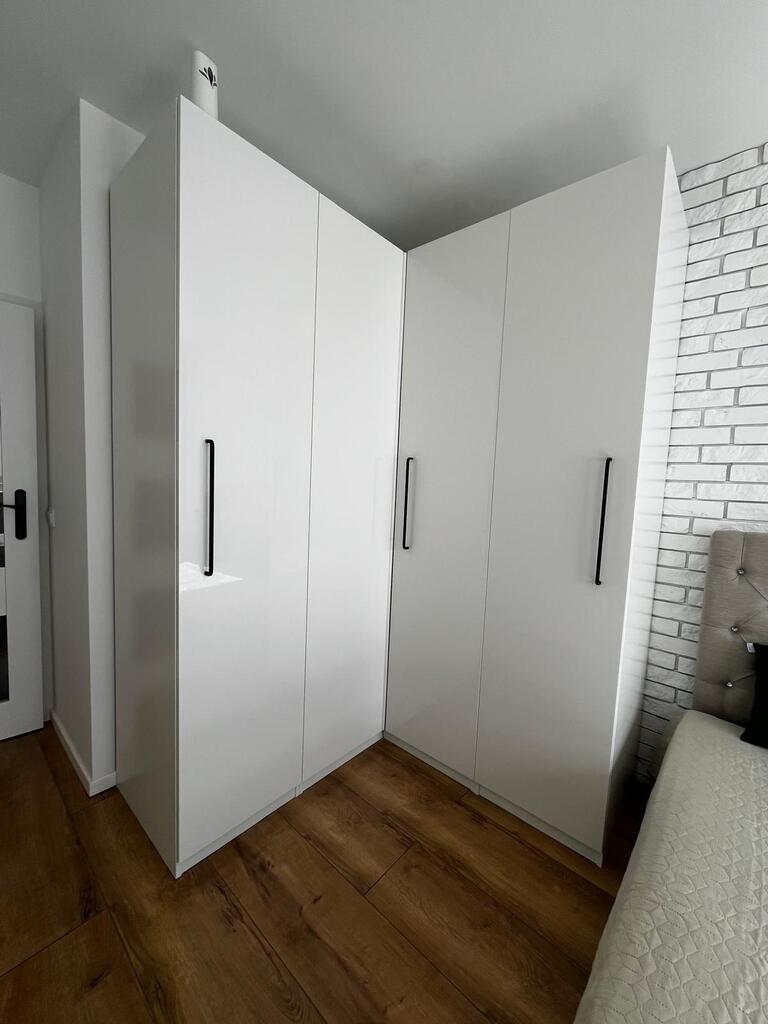 * zgrabna zabudowa meblowa (białe fronty + ciemny korpus)