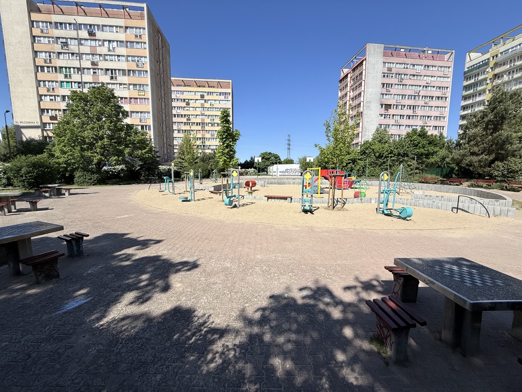 Wokół duża ilość miejsc parkingowych, przy budynku plac zabaw.