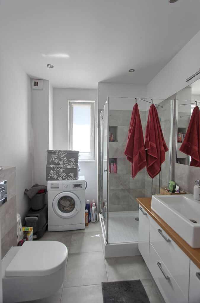 łazienka z prysznicem, w gustownej glazurze i terakocie. Jest pralka.