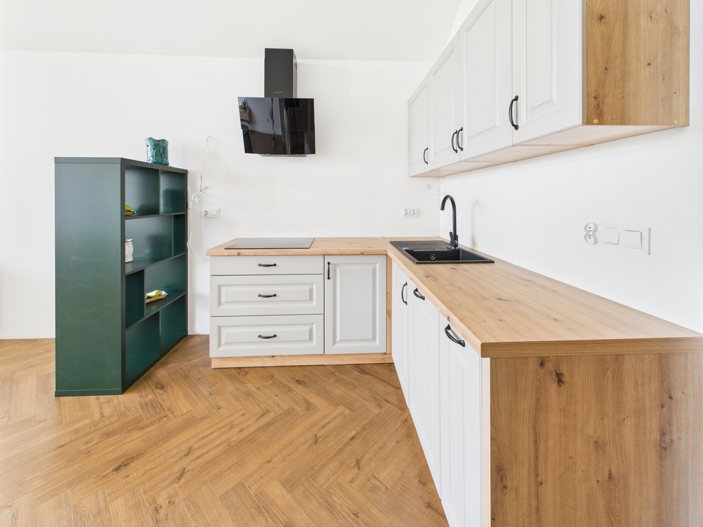 * meble na wymiar w stonowanej kolorystyce, ciepły blat drewniany