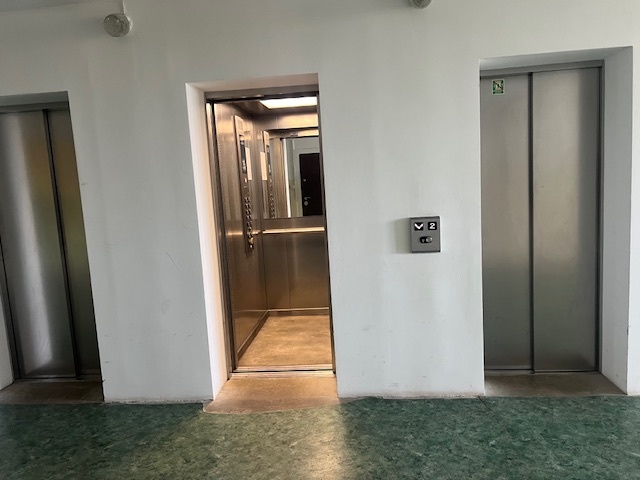 Trzy nowe cichobieżne windy , elewacja budynku i klatka schodowwa po remoncie.