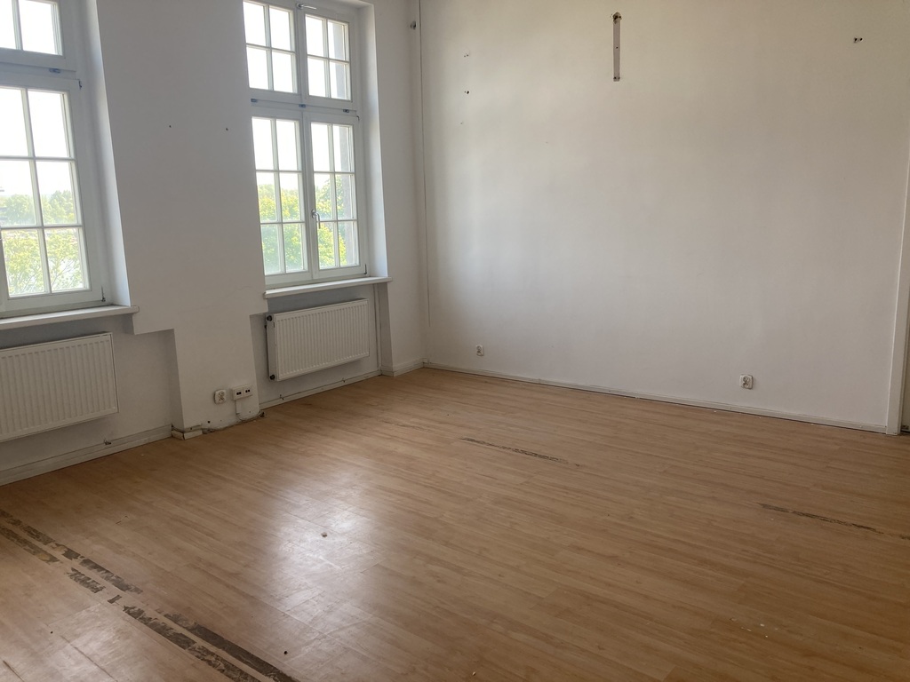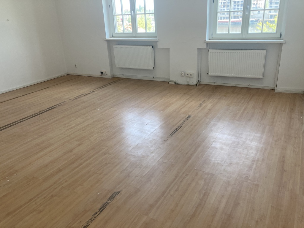 Na podłodze panele, ściany lokalu białe (mogą być też do lekkiego odświeżenia). Dwa duże okna wychodzące na Odrę. Ogrzewanie we własnym zakresie.