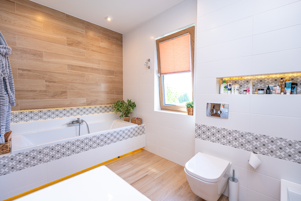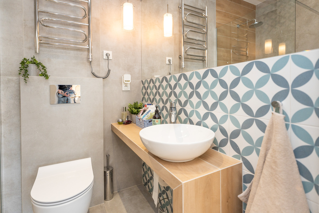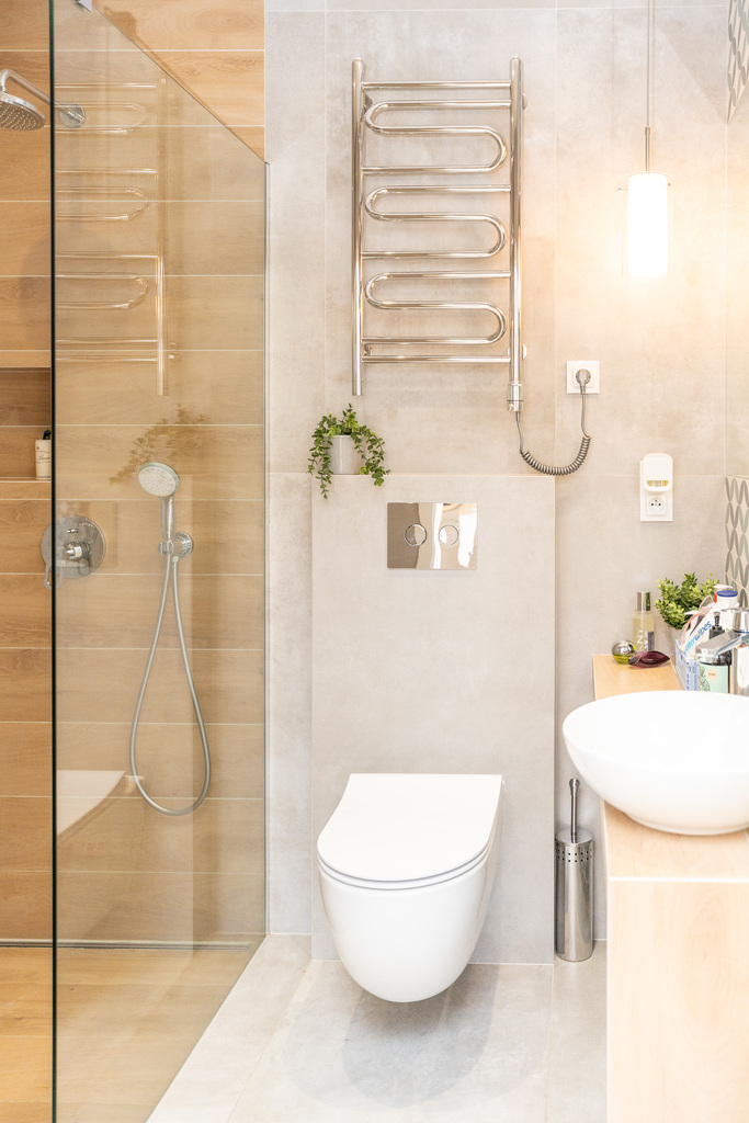 - łazienki z WC wyposażonej w bez brodzikową kabinę prysznicową.