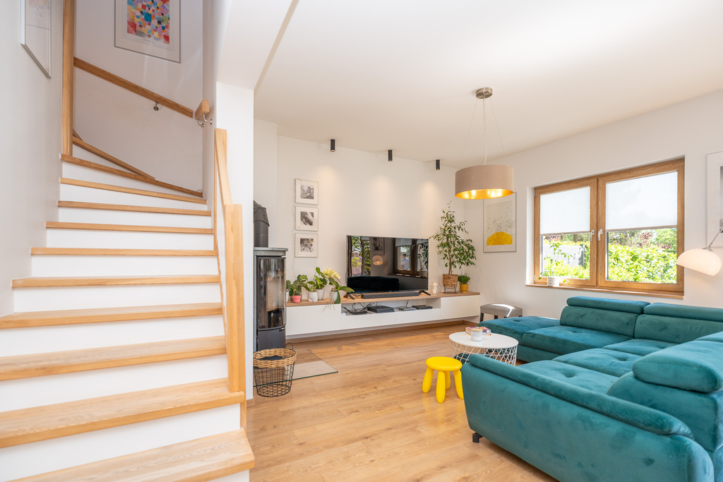 Ściany we wszystkich pokojach gładkie - malowane. Podłogi w pomieszczeniach na parterze jak i na piętrze wykonano paneli podłogowych. Łazienki w wykończone ładną glazurą i terakotą.