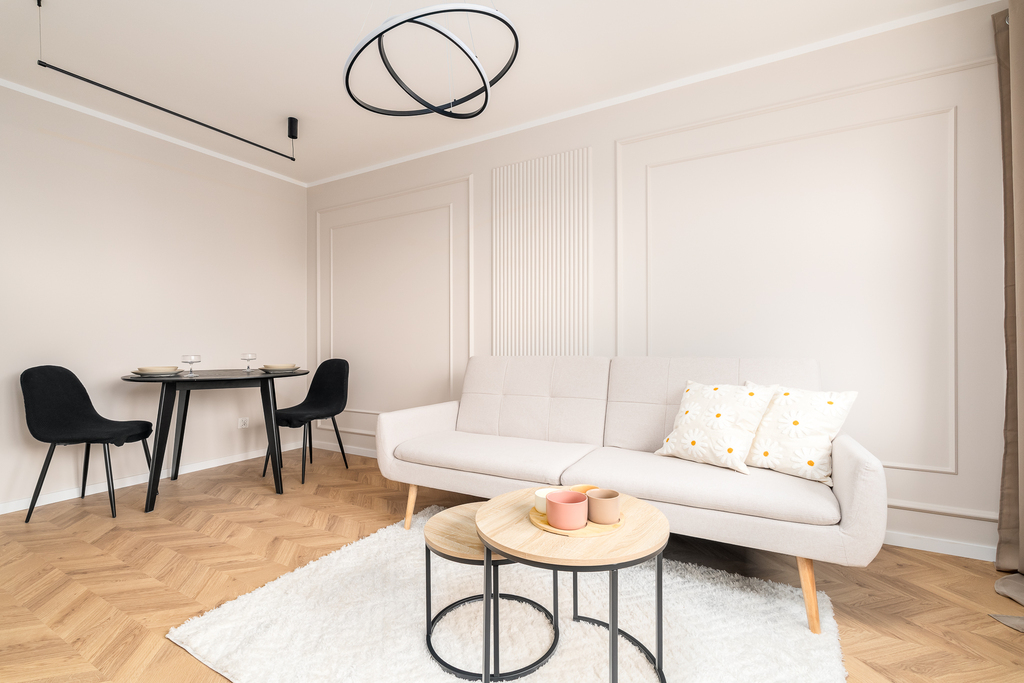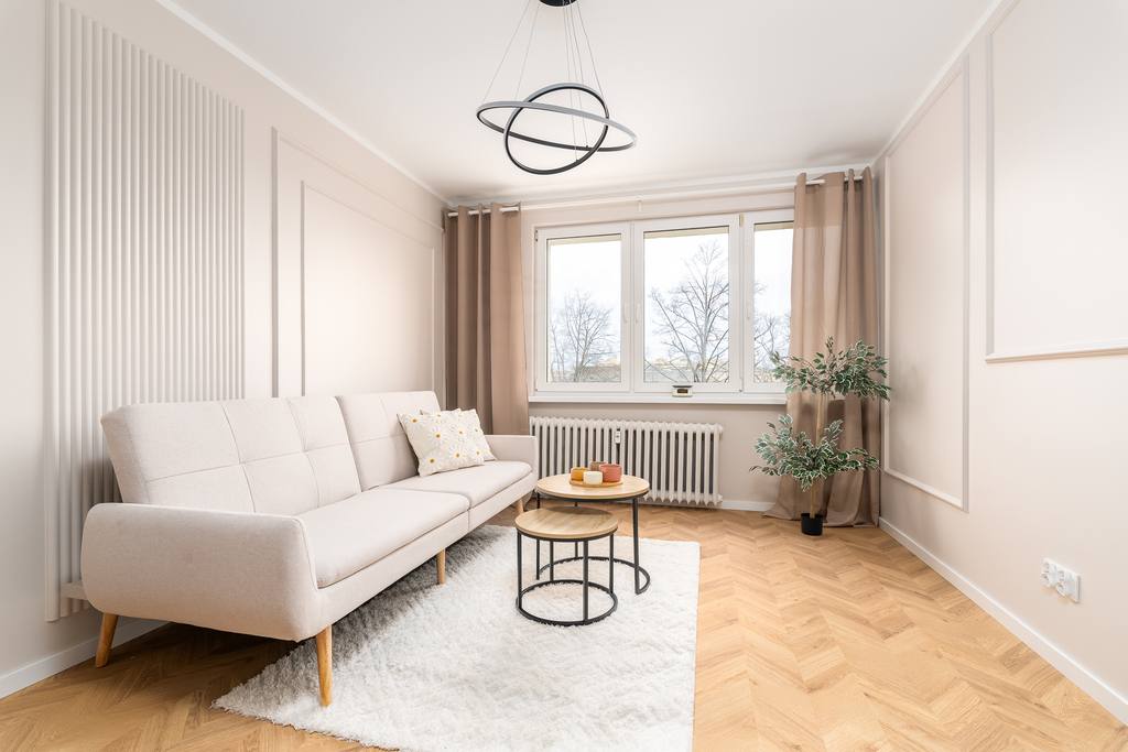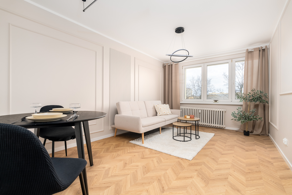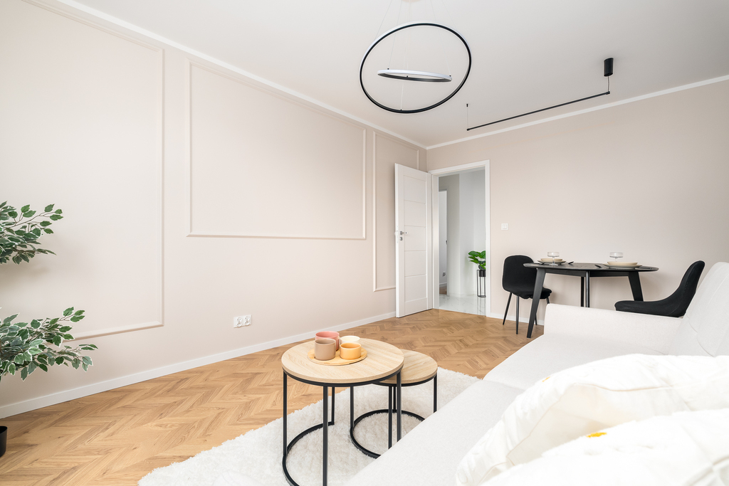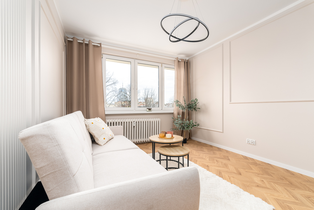 Mieszkanie jest urządzone w nowoczesnym stylu, słoneczne oraz przytulne.