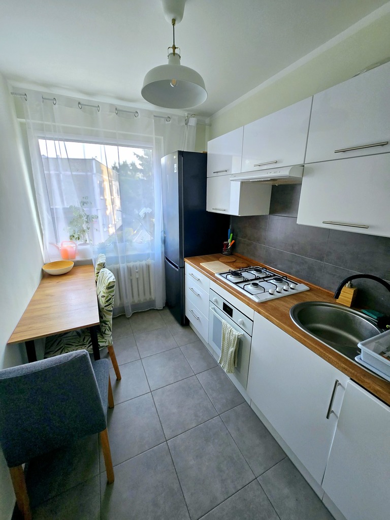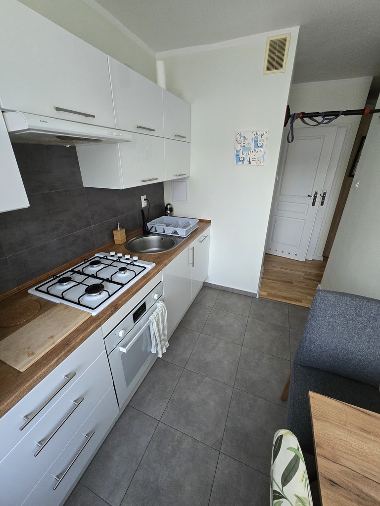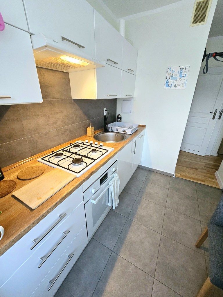 Mieszkanie jest w pełni umeblowane. W kuchni mamy lodówkę, zmywarkę piekarnik i kuchenkę gazową. W łazience jest pralka.