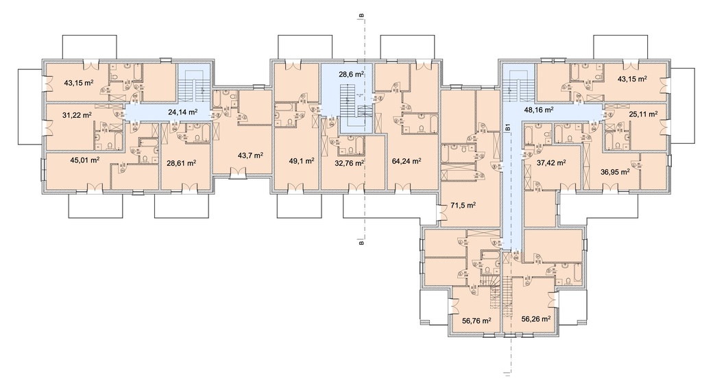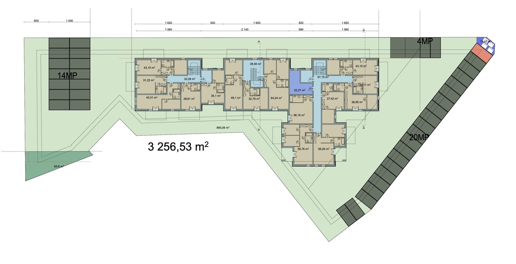 Wstępna koncepcja przewiduje budynek 3 klatkowy, po 15 mieszkań w klatce.