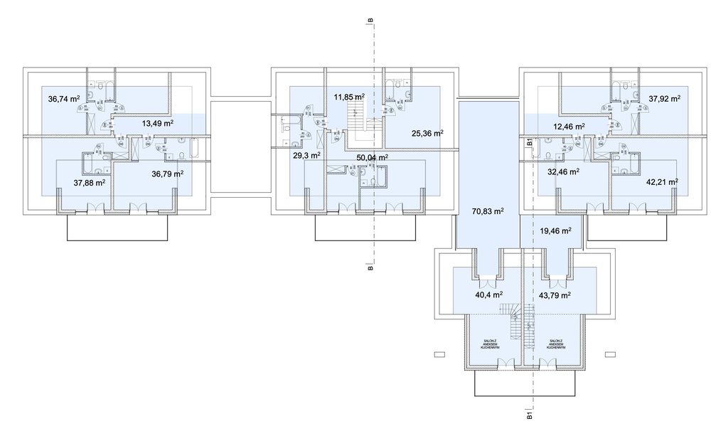 W każdej klatce 2 mieszkania II-poziomowe z tarasami.