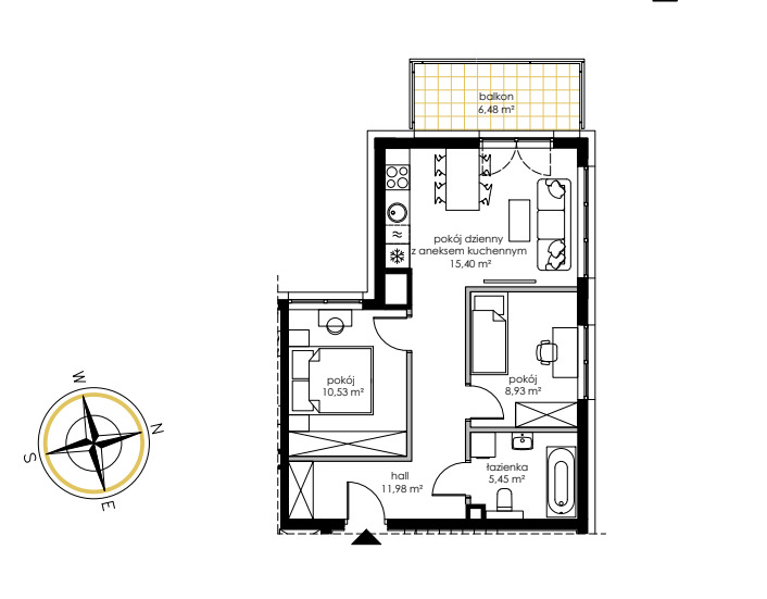 - salon z aneksem kuchennym o powierzchni 15,40 m2 z wyjściem na balkon