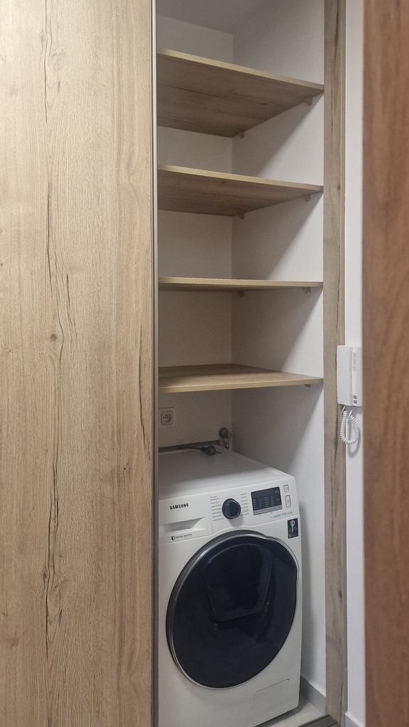 W kuchni meble w zabudowie wraz ze wysokiej jakości sprzętem AGD.