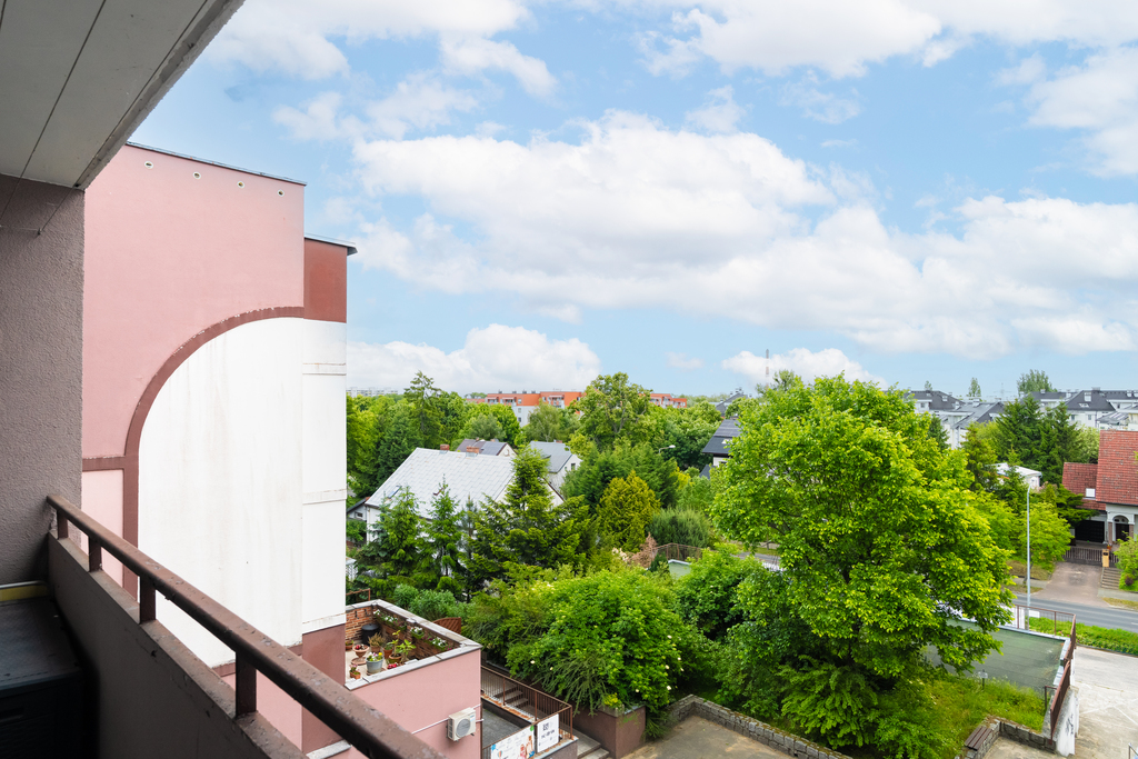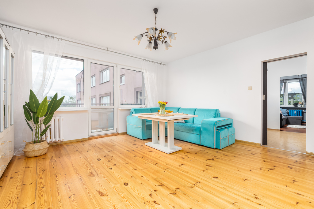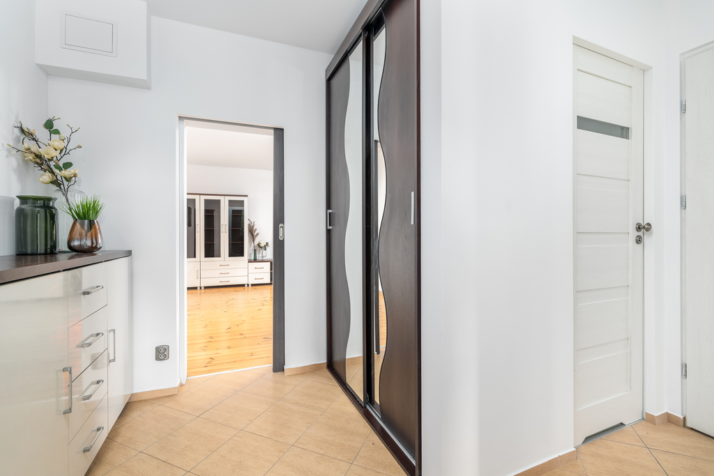 Wnętrze jest bardzo wygodne, utrzymane w dobrym standardzie; przedpokój z pojemną szafą, stąd jest wejście do wszystkich pozostałych pomieszczeń. Znaczącą strefę dzienną stanowi słoneczny, ponad 20-sto metrowy salon z wyjściem na balkon.