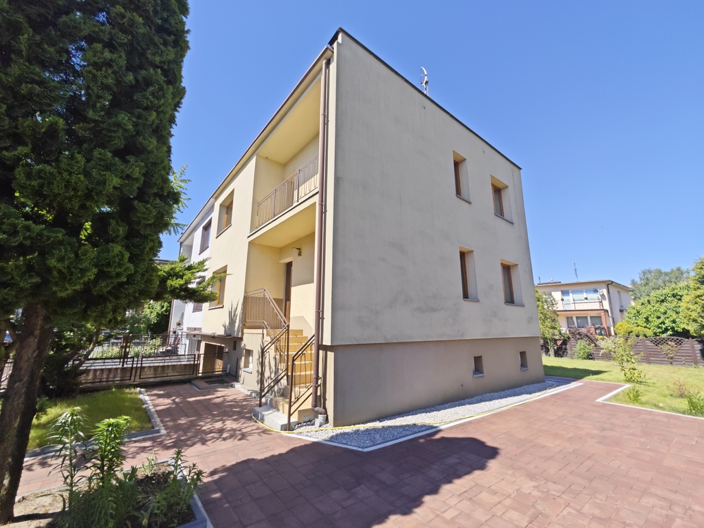Niewątpliwym atutem nieruchomości jest ładnie zagospodarowany ogród (mniejsza część znajduje się od strony ulicy, zaś główny ogród znajduje się na tyłach nieruchomości). Ogród jest przede wszystkim pokryty ładnie utrzymanym trawnikiem z alejkami wyłożonymi polbrukiem plus nieliczne drzewka (wierzba oraz dwie wiśnie) i dodatkowo miejsce do wypoczynku pod rozstawianym namiotem. Ogródek jest bardzo słoneczny. Poza garażem w bryle budynku - na posesję można wjechać przez drugą bramę wjazdową, aby zaparkować dwa kolejne samochody (przed posesją kolejne dwa miejsca postojowe).