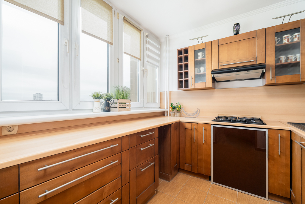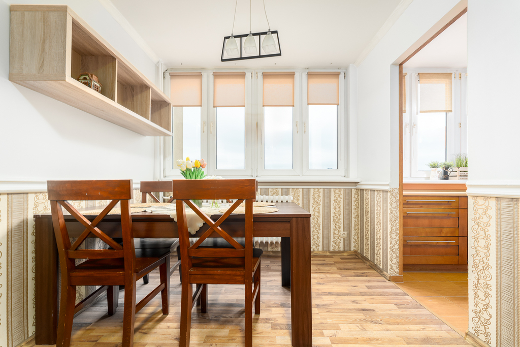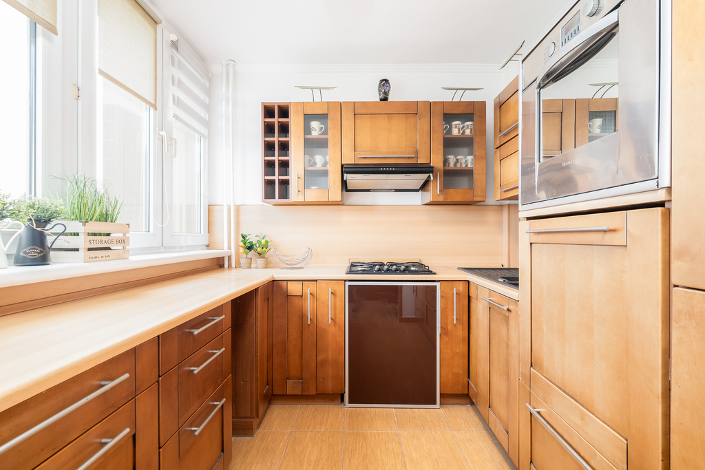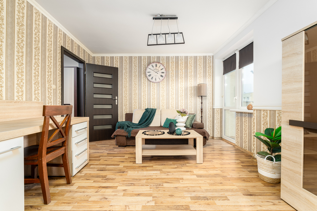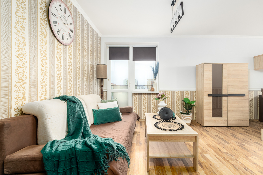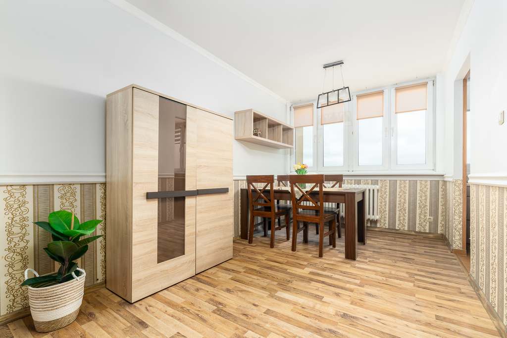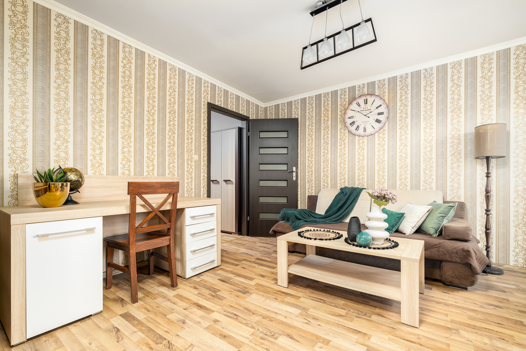 W pełni wyposażone wnętrza obejmują salon z sofą, stołem, czterema krzesłami, biurkiem - sekretarzykiem oraz stolikiem kawowym. Sypialnia posiada komodę, półki, biurko i kredens, tworząc idealne miejsce do wypoczynku i pracy. Kuchnia z litego drewna ze sprzętem AGD w zabudowie umożliwia przygotowywanie posiłków w komfortowych warunkach. Łazienka wykończona glazurą i terakotą z kabiną prysznicową spełni oczekiwania nawet najbardziej wymagających lokatorów.
