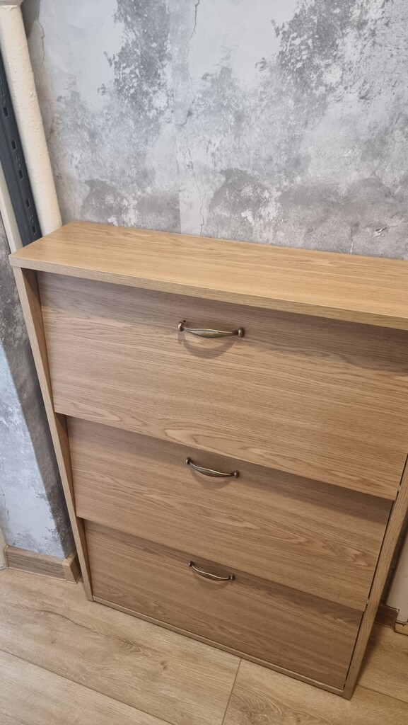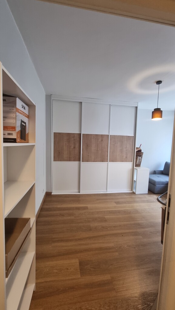 W pokoju panele, na wyposażeniu szafa typu komandor, stół, narożnik. W przedpokoju szafka na buty.