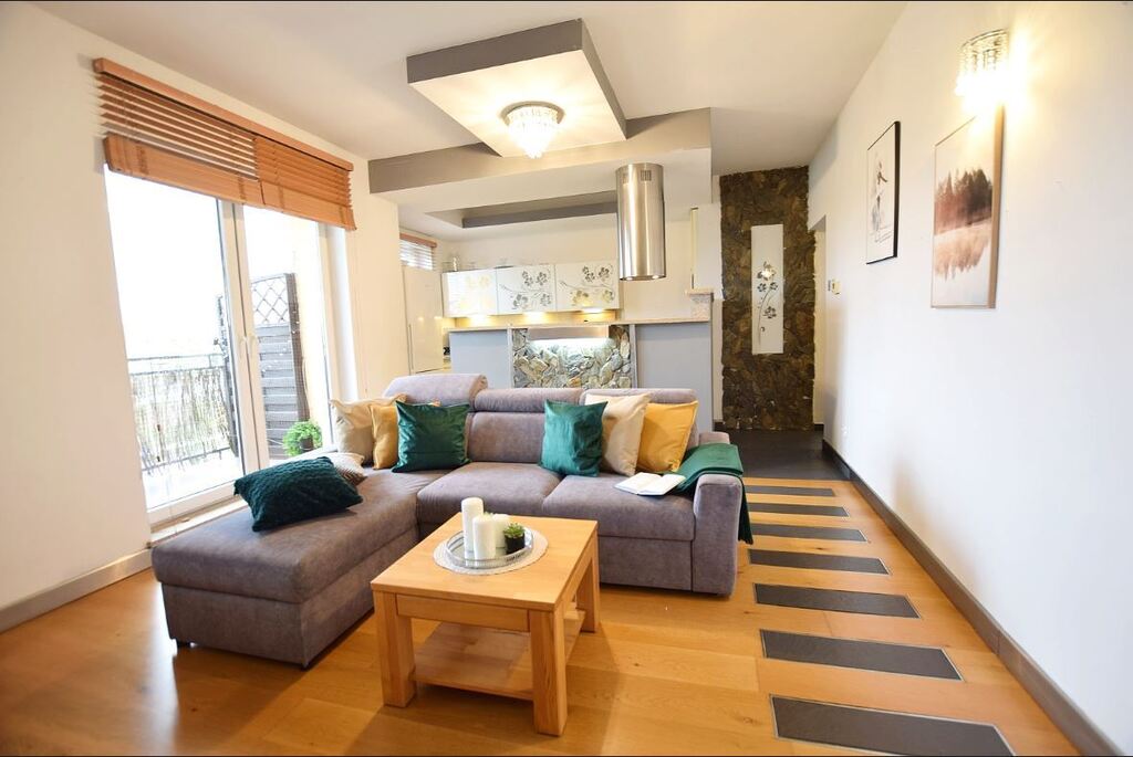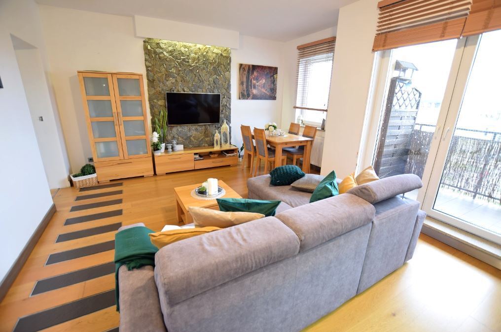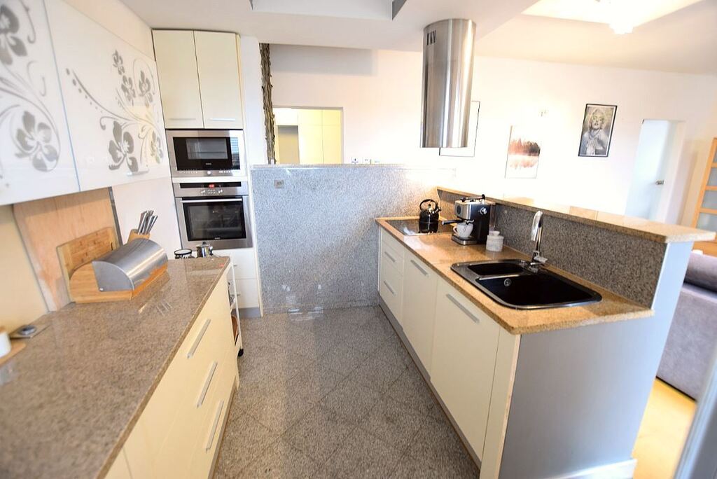 Mieszkanie o podwyższonym standardzie (blaty kuchenne z naturalnego kamienia, designerskie meble łazienkowe z oryginalną umywalką z kamienia na zamówienie, wysokiej klasy deski podłogowe itp.), estetycznie urządzone /w kolorystyce zgodnej z aktualnymi trendami wyposażenia wnętrz.