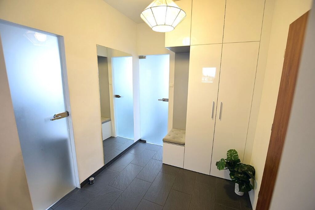 - przedpokój z nowoczesną szafą w zabudowie stałej.
