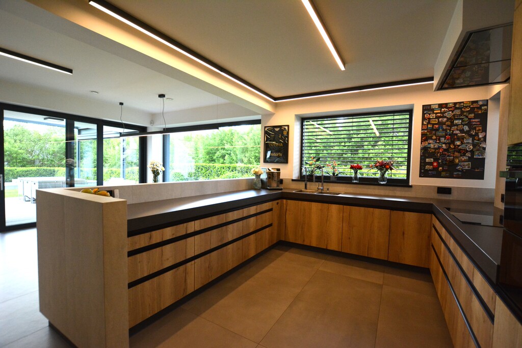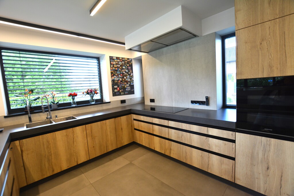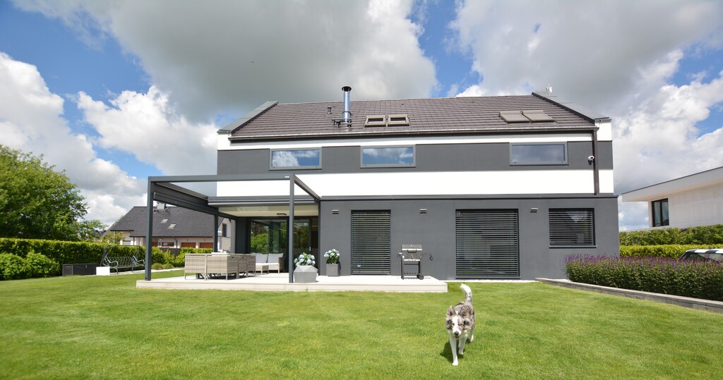 Dach kryty dachówką ceramiczną, tytanowa blacharka oraz orynnowanie. Aluminiowe okna z ciepłym montażem. Rozprowadzona rekuperacja Shender. Ogrzewanie podłogowe w całym domu.