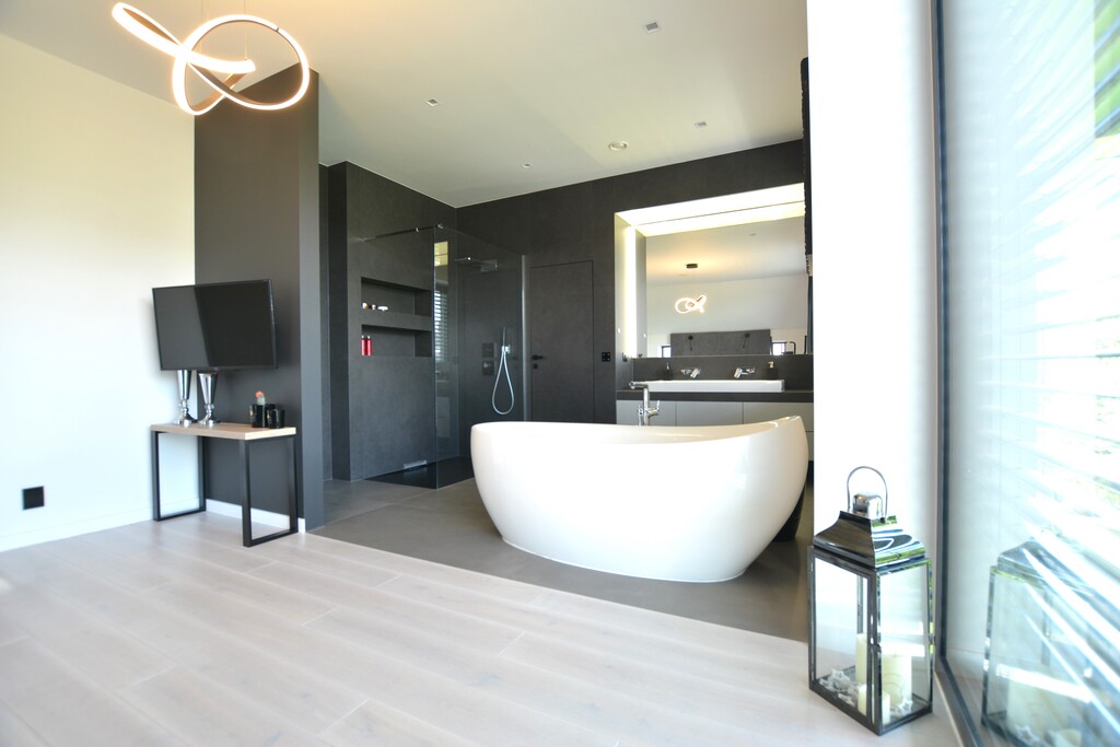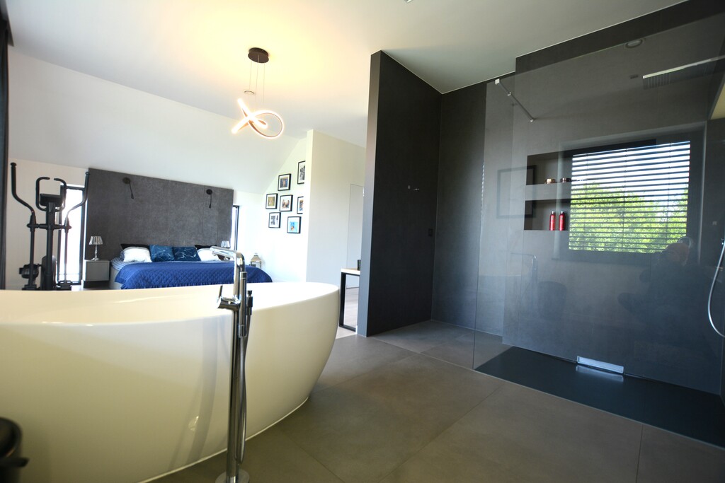 Piętro: sypialna rodzicielska, przestronna 19,51m² z prywatnym salonem kąpielowym 14,92m², wyposażonym w wannę i kabinę natryskową. Dwie duże sypialnie. Łazienka w glazurze najwyższej jakości, nowoczesna i stylowa, zaprojektowana z myślą o komforcie. Garderoba; elegancka przestrzeń, zapewniająca dużo miejsca na przechowywanie ubrań i akcesoriów.