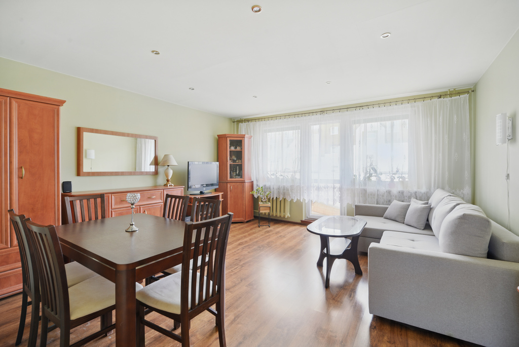 - jasny salon z wyjściem na duży balkon,