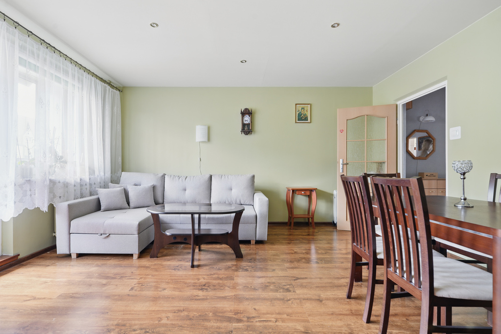 Na podłodze w salonie, pokoju oraz przedpokoju ładne panele, w kuchni, łazience i WC kafle.
