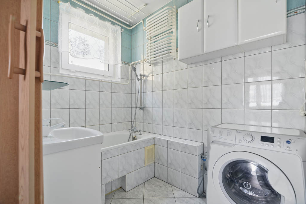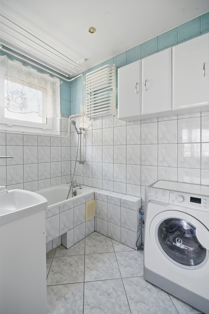 Łazienka z oknem, wanną, umywalką i pralką. WC osobno.