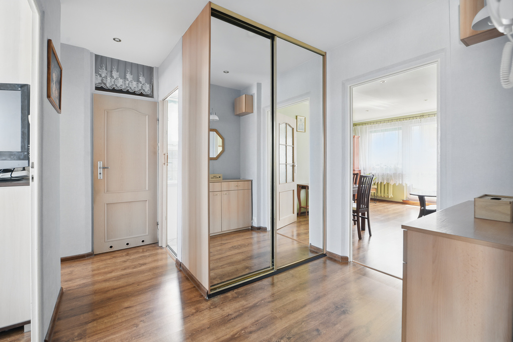 Mieszkanie bardzo zadbane i w dobrym stanie. W pokojach na ścianach jasne tapety.