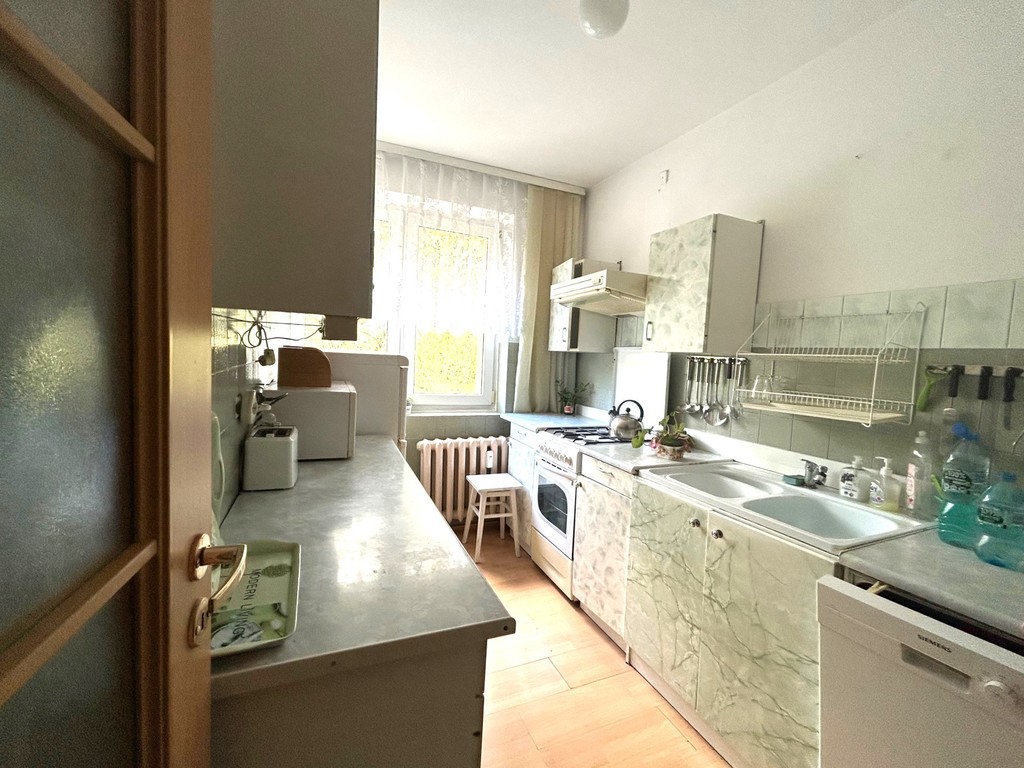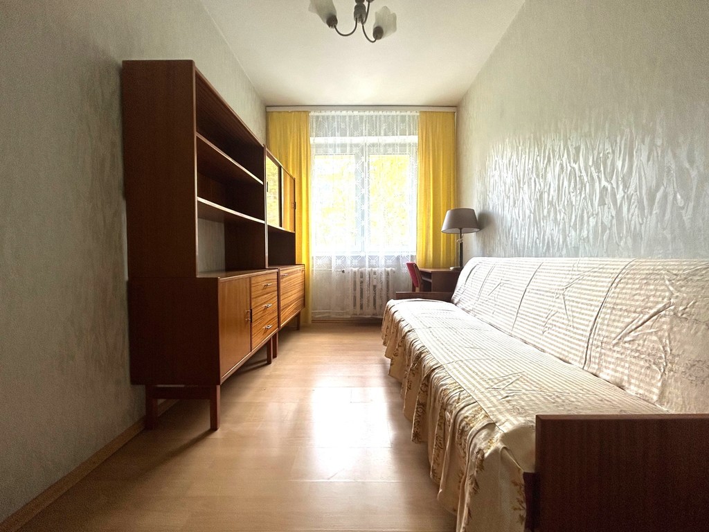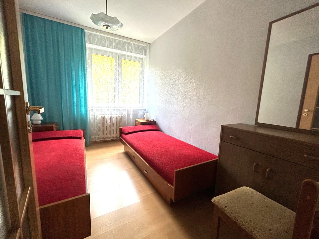 Cztery osobne pokoje (z największego wyjście  balkon), osobna kuchnia (meble starszego typu), obszerny przedpokój z dużą szafą (starszego typu),  łazienka (pralka kabina prysznicowa, umywalka), osobna toaleta. W mieszkaniu może pozostać pełne wyposażenie widoczne na zdjęciach.
