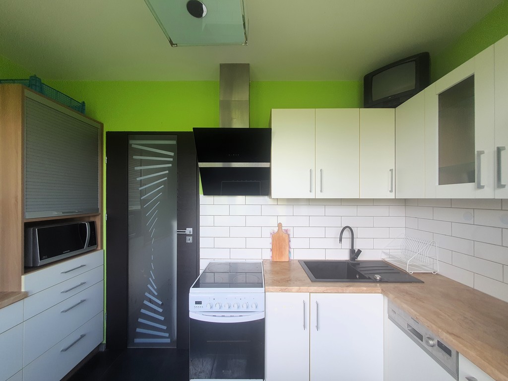 * spora widna kuchnia wyposażona w piekarnik elektryczny i płytę 4-polową, okap, lodówkę z zamrażarką, dużo przestrzenie roboczej i miejsca w szafkach