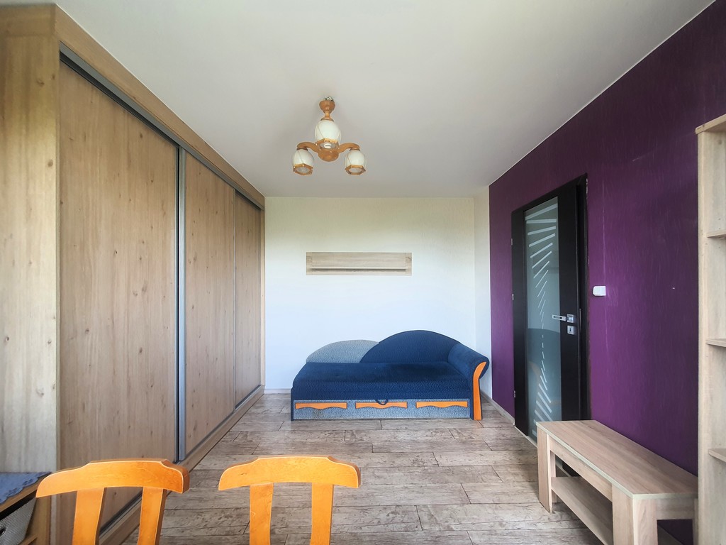 * w pokoju sofa rozkładana, pojemna szafa, stolik z krzesłami i TV