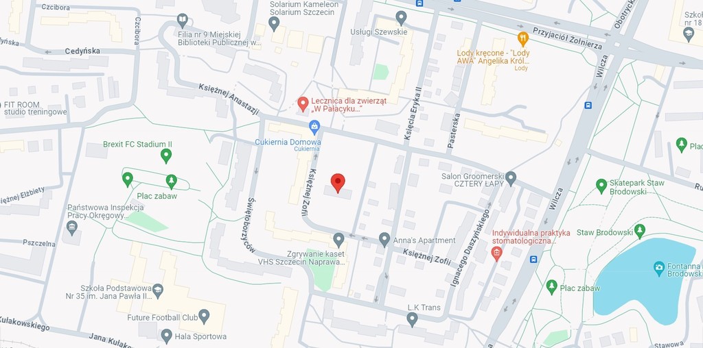 Mieszkanie znajduje się w cichej i spokojnej okolicy przy ul. Księżnej Zofii. W pobliżu znajdują się sklepy małe i duże, gastronomia, poczta, kościół, Staw Brodowski, basen (SP10), hala sportowa (SP35). Miejsce jest świetnie skomunikowane – w pobliżu przystanki linii 57, 58, 59, 63, 68, 69, 80, 82, 101, 107, 522, 524. Dobry dojazd do centrum miasta, jak i w kierunku Polic i Łękna.