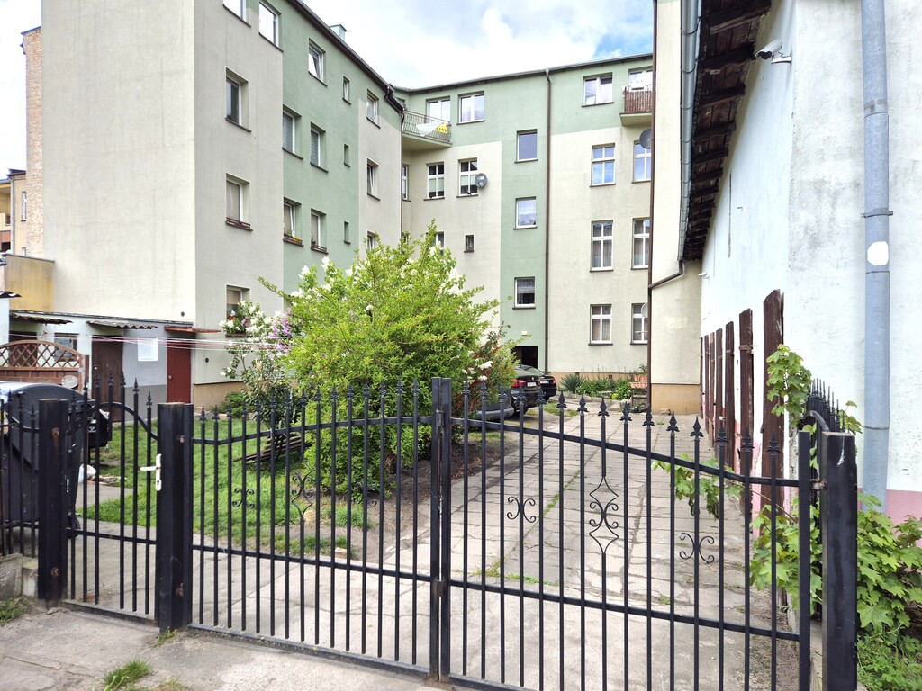 * oficyna kamienicy z zielonym podwórkiem