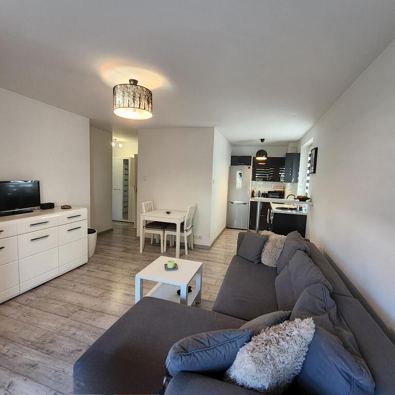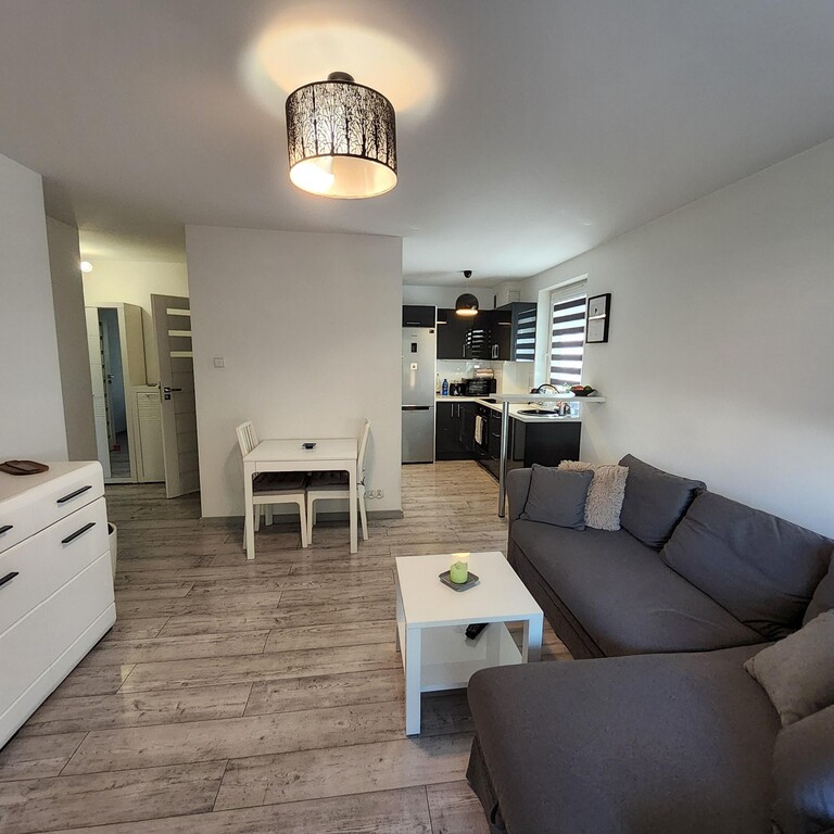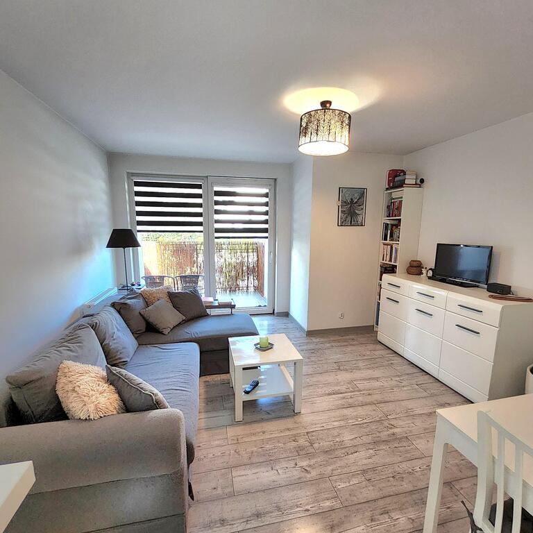 Na sprzedaż mieszkanie usytuowane na parterze 2 piętrowego bloku, znajdującego się w nowym kompleksie mieszkaniowym, w zacisznej, zielonej części miasta. Na powierzchni ok 38m2 znajduje się salon o pow. ok. 17m2 z wyjściem na przestronny balkon o pow ok 4m2, jest również wyodrębniona część kuchenna wyposażona w sprzęt AGD, meble w zabudowie. Z przedpokoju o pow. ok. 4m2 jest wejście do ok 9m2 sypialni oraz łazienki z wc. Na podłodze położono panele, ściany malowane.