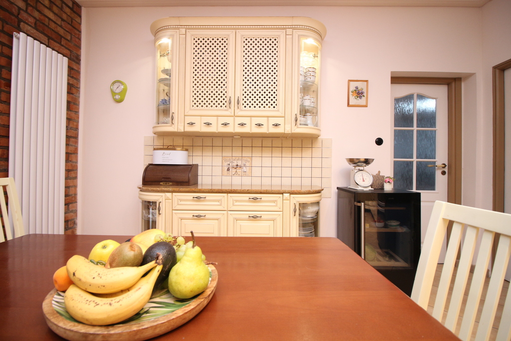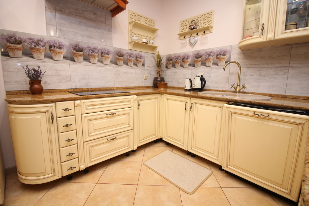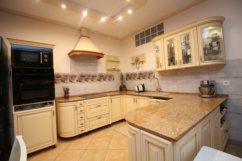 Serce domu stanowi klimatyczna kuchnia w stylu prowansalskim – wyposażona w nowoczesny sprzęt AGD i elegancki blat z naturalnego granitu. To miejsce, które sprzyja wspólnemu gotowaniu i spędzaniu czasu z rodziną.